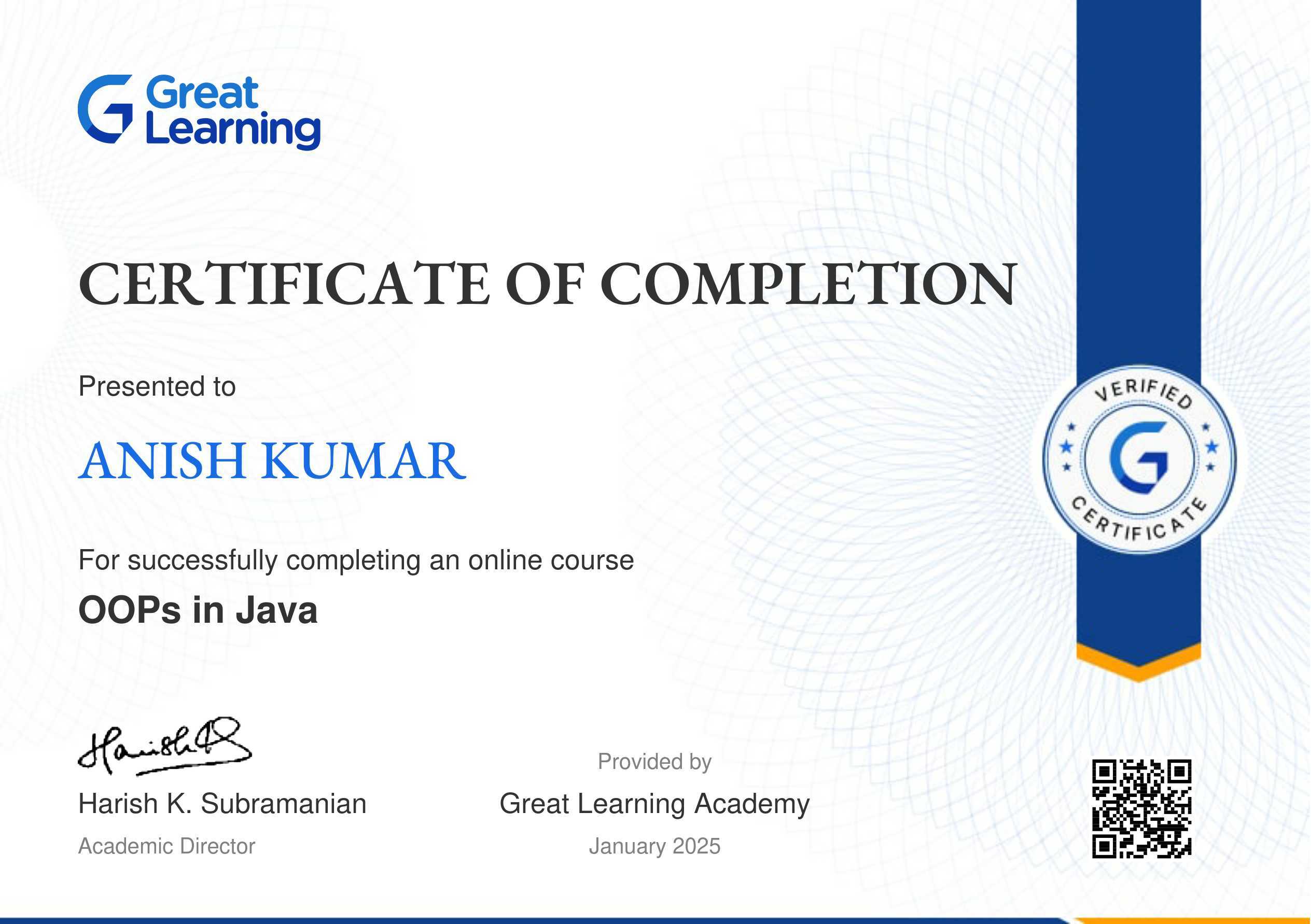 The certificate above verifies that Anish Kumar has successfully completed the course OOPs in Java