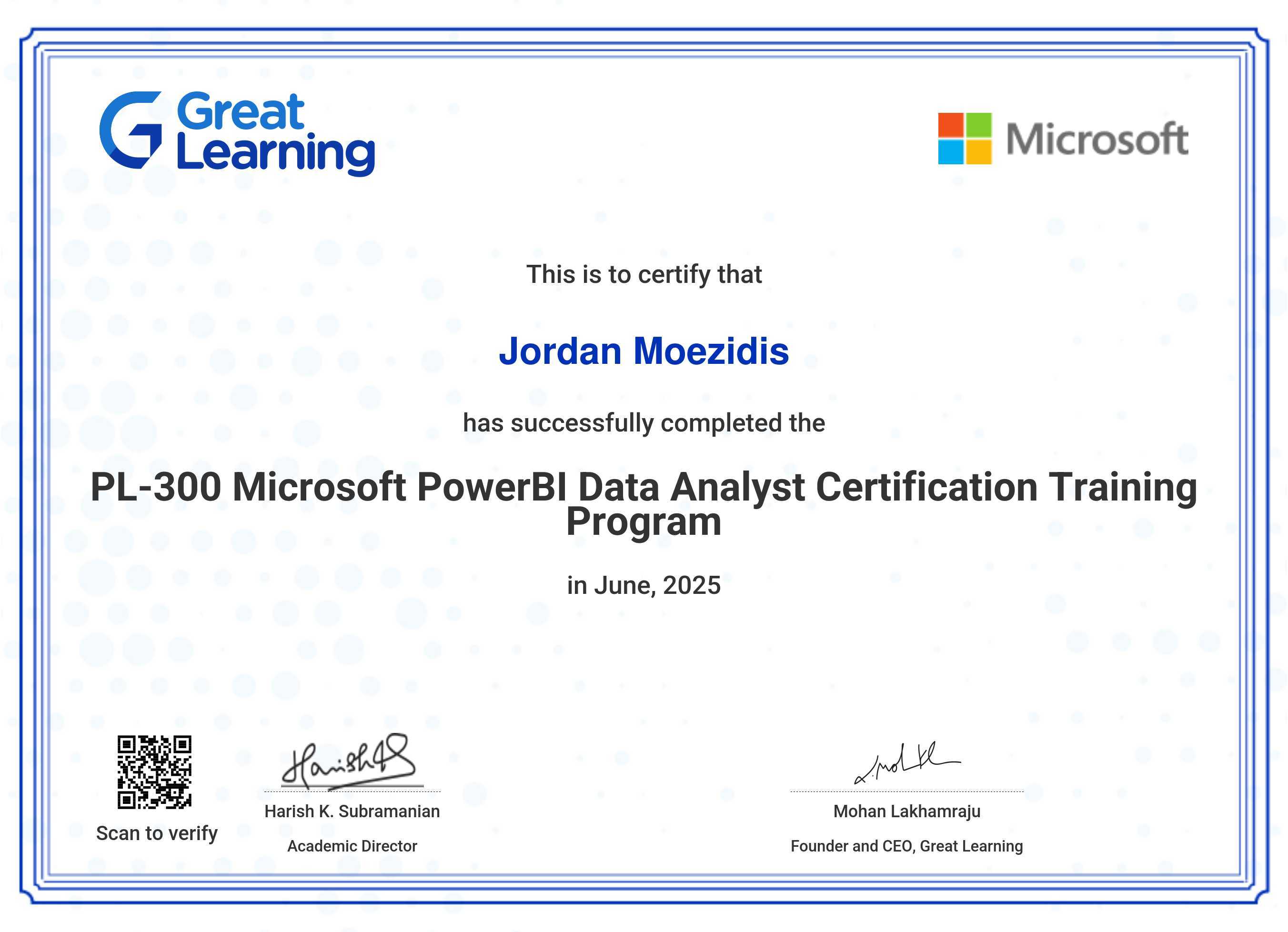 The certificate below verifies that JORDAN MOEZIDIS has completed the PL-300 MICROSOFT PowerBI DATA ANALYST CERTIFICATION TRAINING PROGRAM