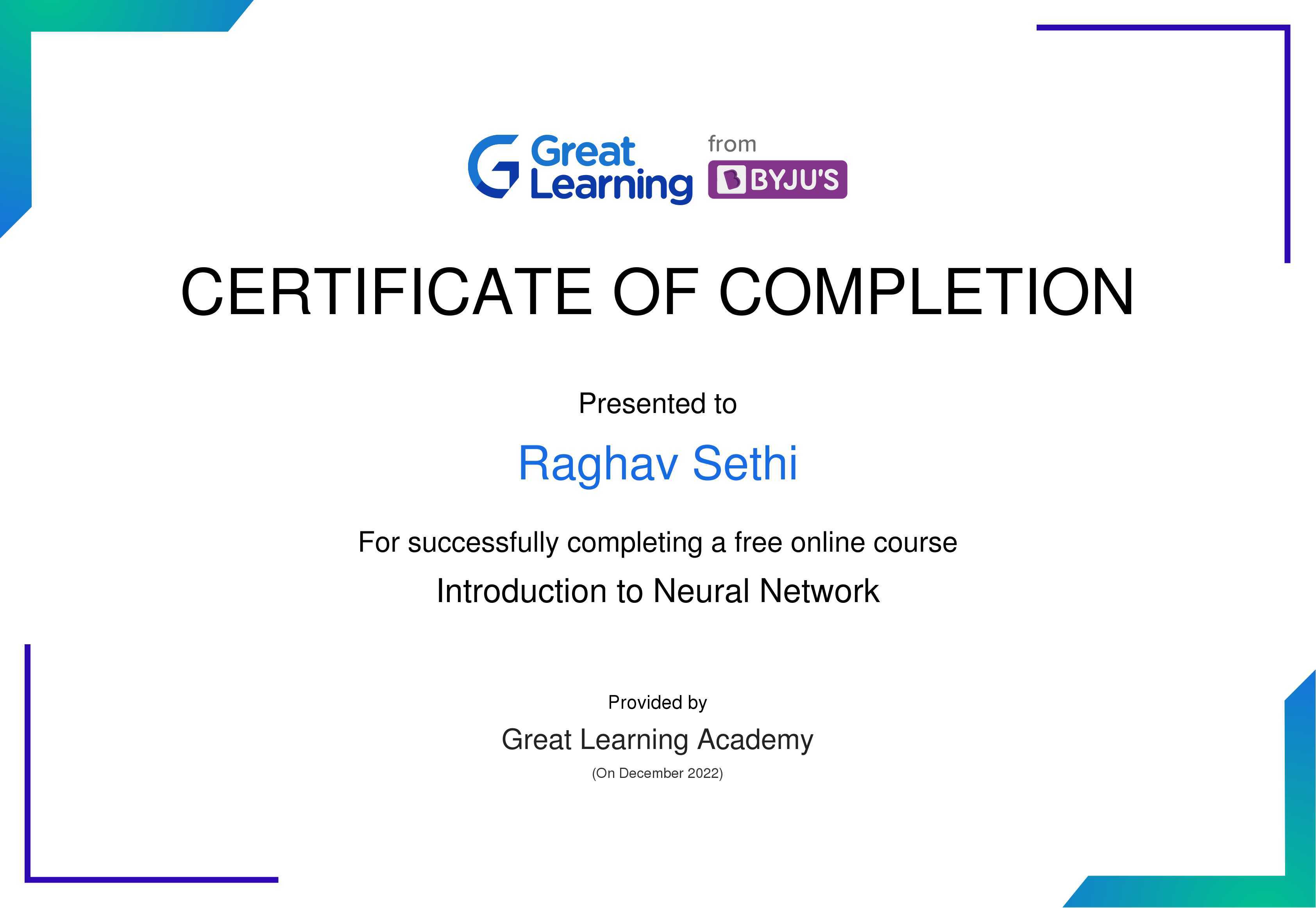 The certificate above verifies that Raghav Sethi has successfully completed the course Introduction to Neural Network