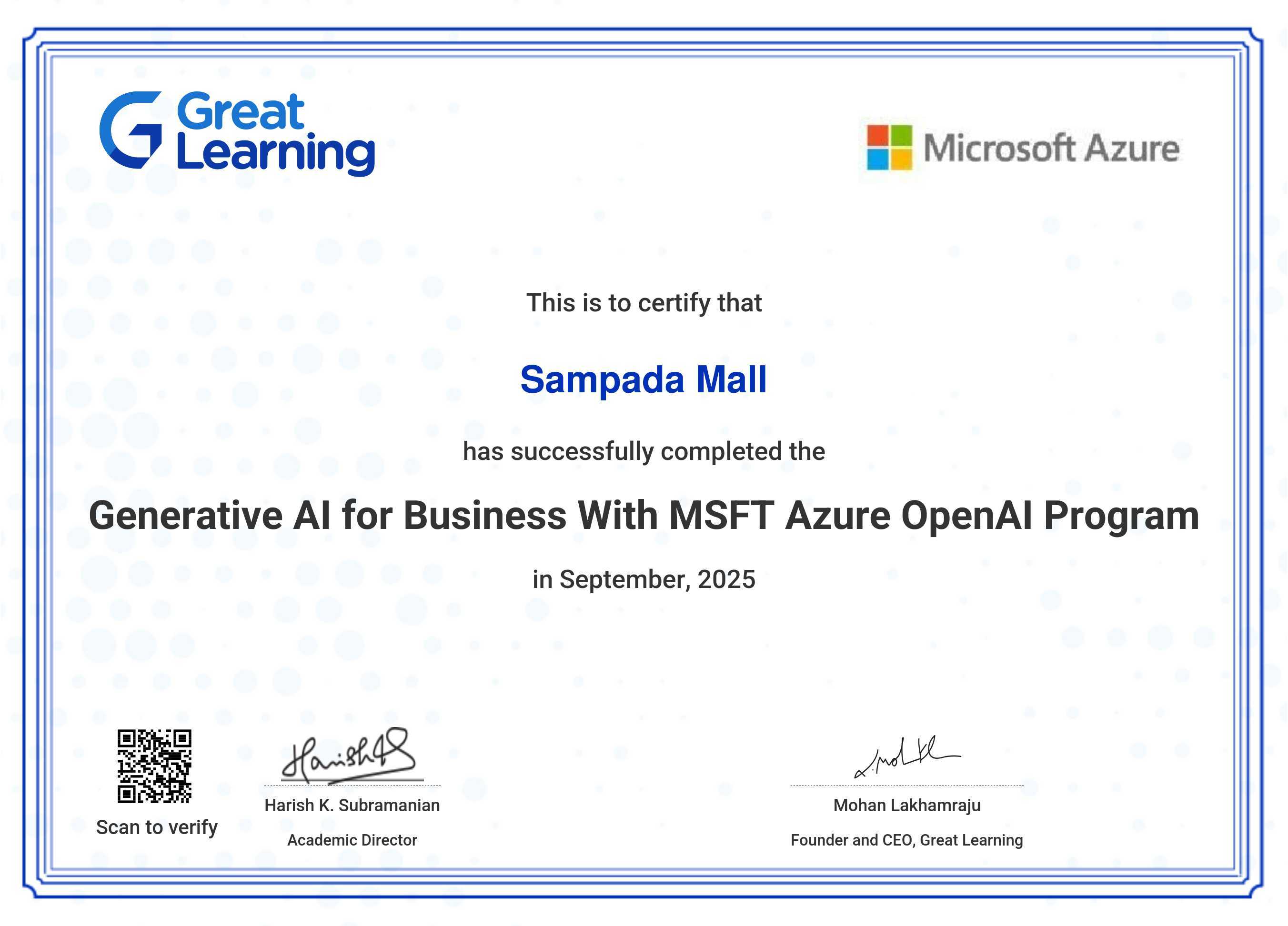 The certificate below verifies that SAMPADA MALL has completed the GENERATIVE AI for BUSINESS WITH MSFT AZURE OpenAI PROGRAM