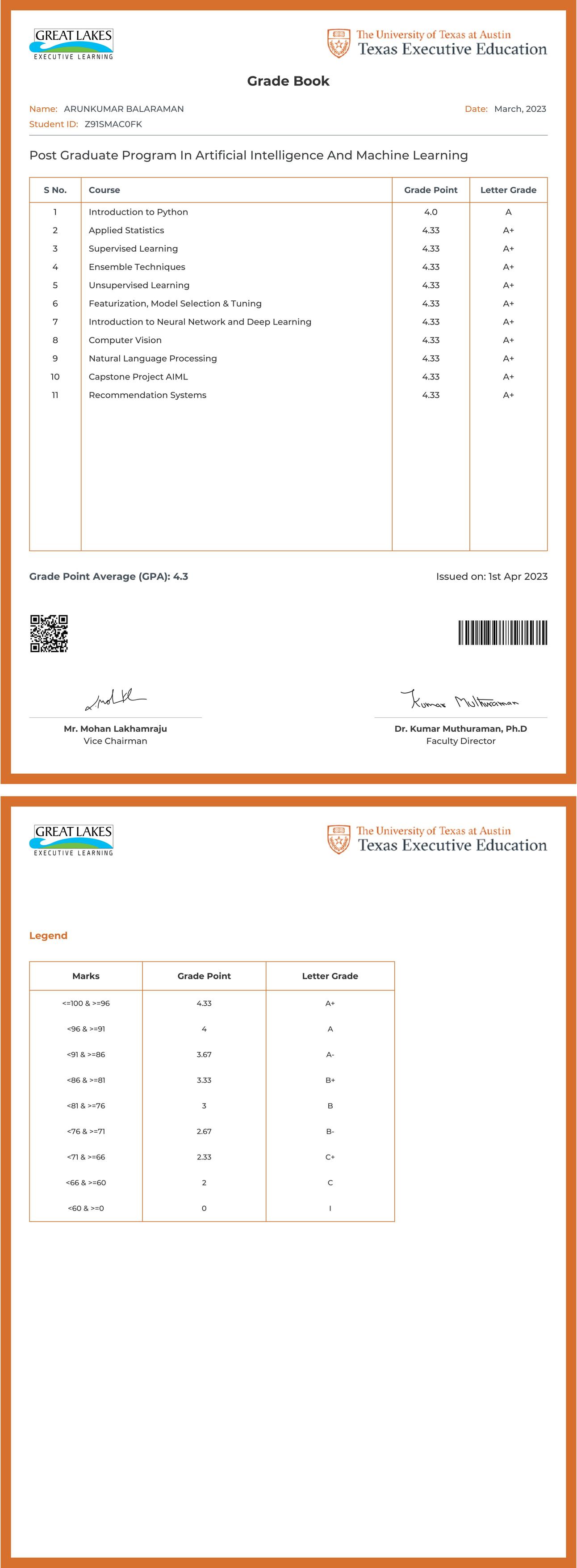 The transcript below verifies that ARUNKUMAR BALARAMAN has completed the POST GRADUATE PROGRAM IN ARTIFICIAL INTELLIGENCE AND MACHINE LEARNING