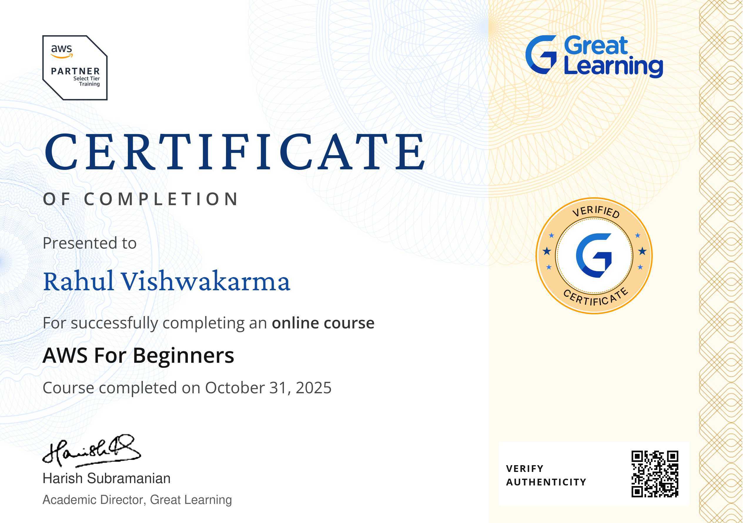 The certificate above verifies that Rahul Vishwakarma has successfully completed the course AWS For Beginners