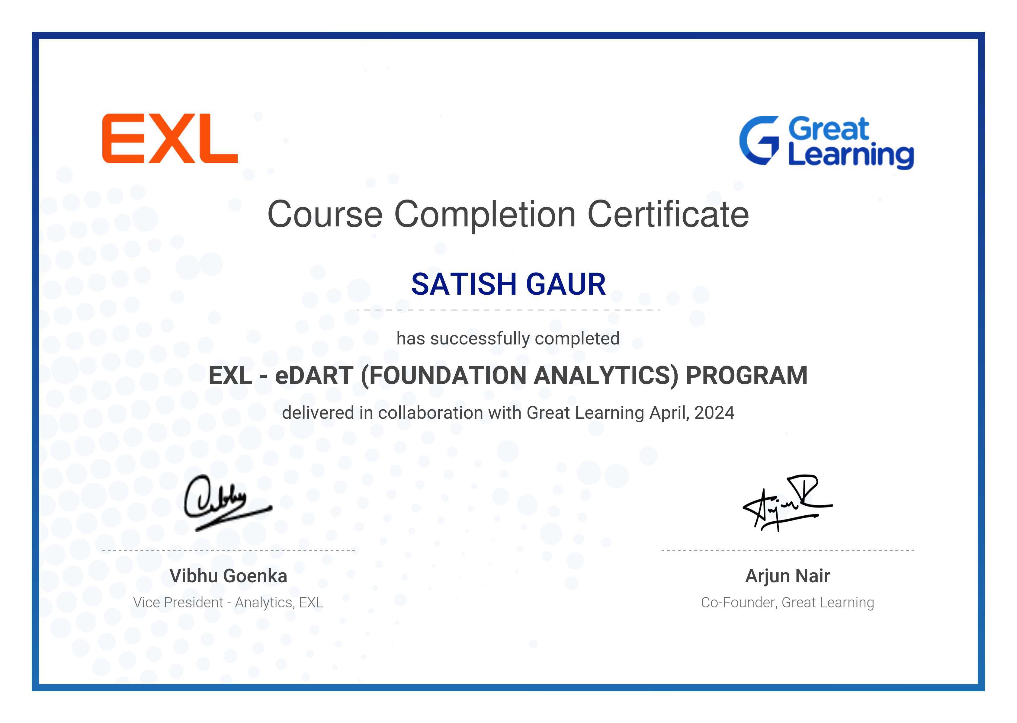 The certificate below verifies that SATISH GAUR has completed the EXL - eDART (Foundation Analytics) Program