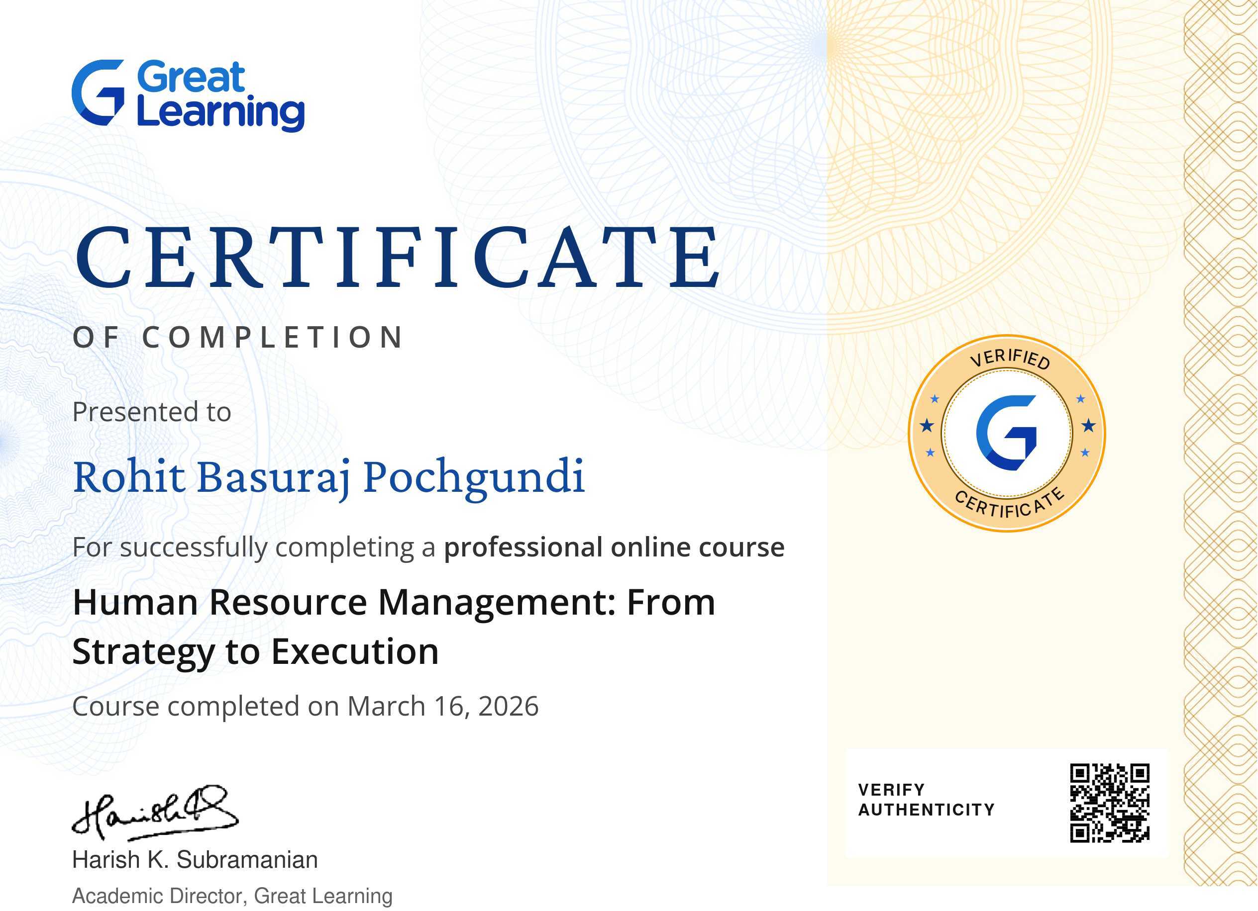 The certificate above verifies that Rohit Basuraj Pochgundi has successfully completed the course Human Resource Management: From Strategy to Execution