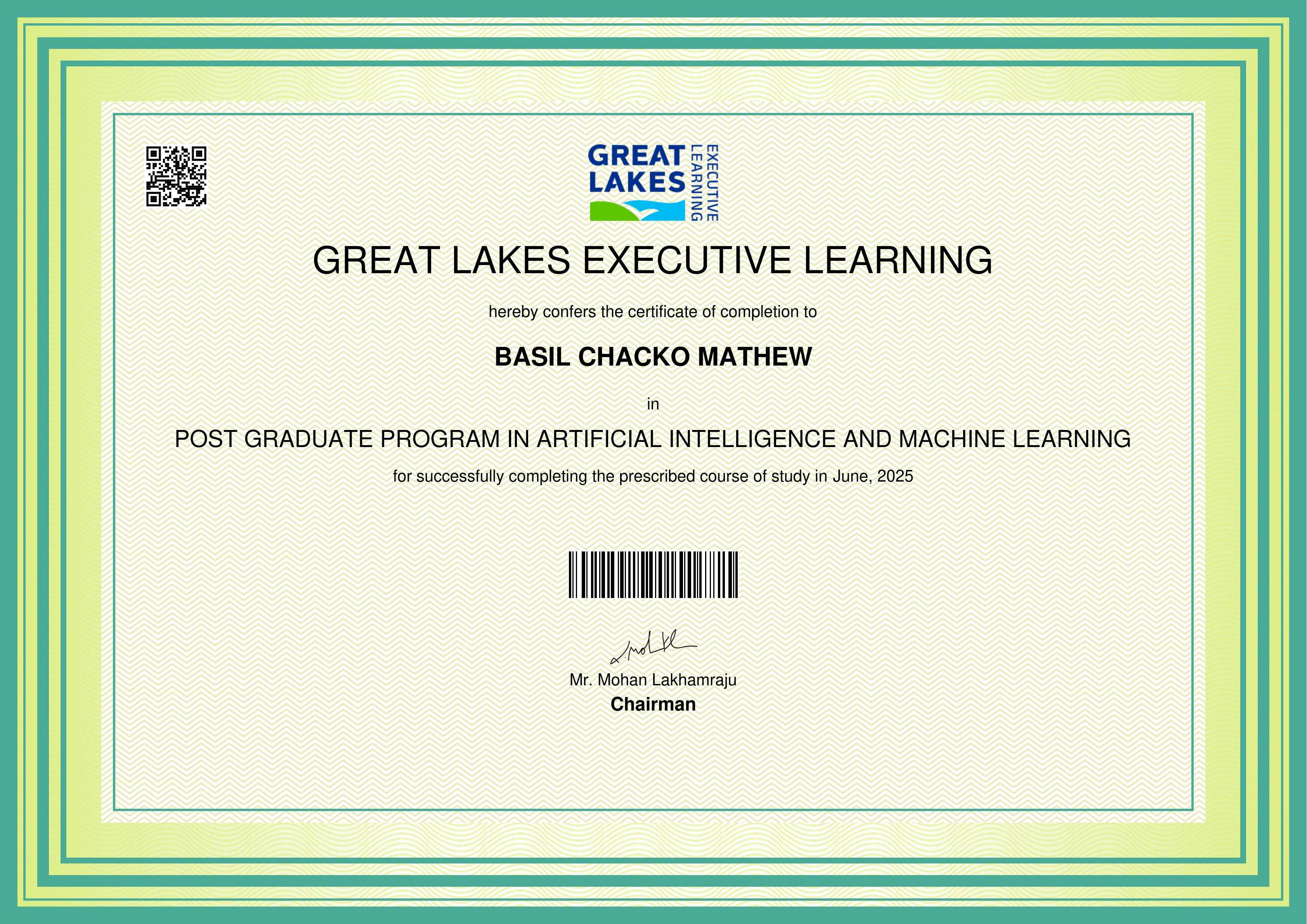 The certificate below verifies that BASIL CHACKO MATHEW has completed the POST GRADUATE PROGRAM IN ARTIFICIAL INTELLIGENCE AND MACHINE LEARNING