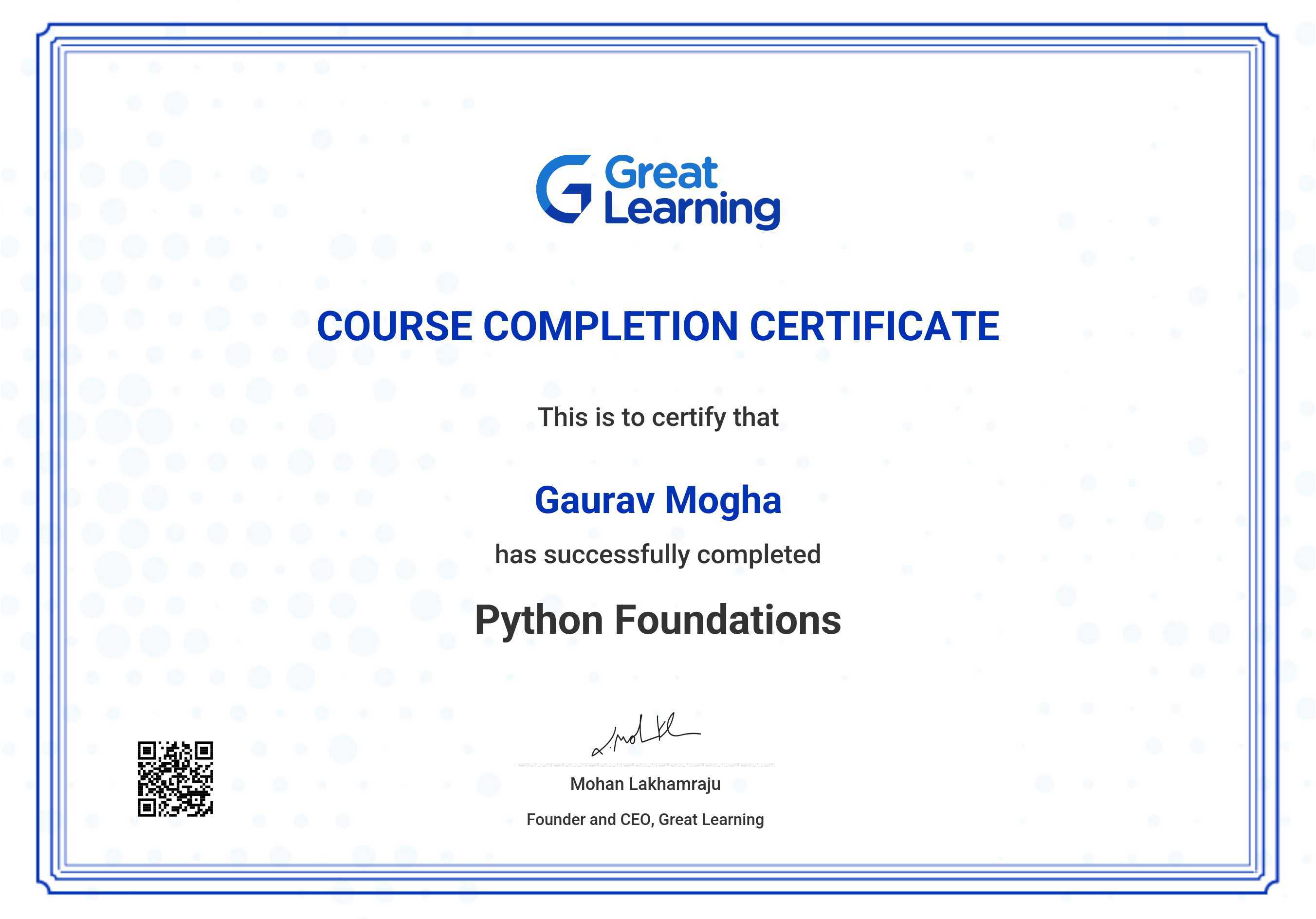 The certificate below verifies that Gaurav Mogha has completed the Python Foundations course