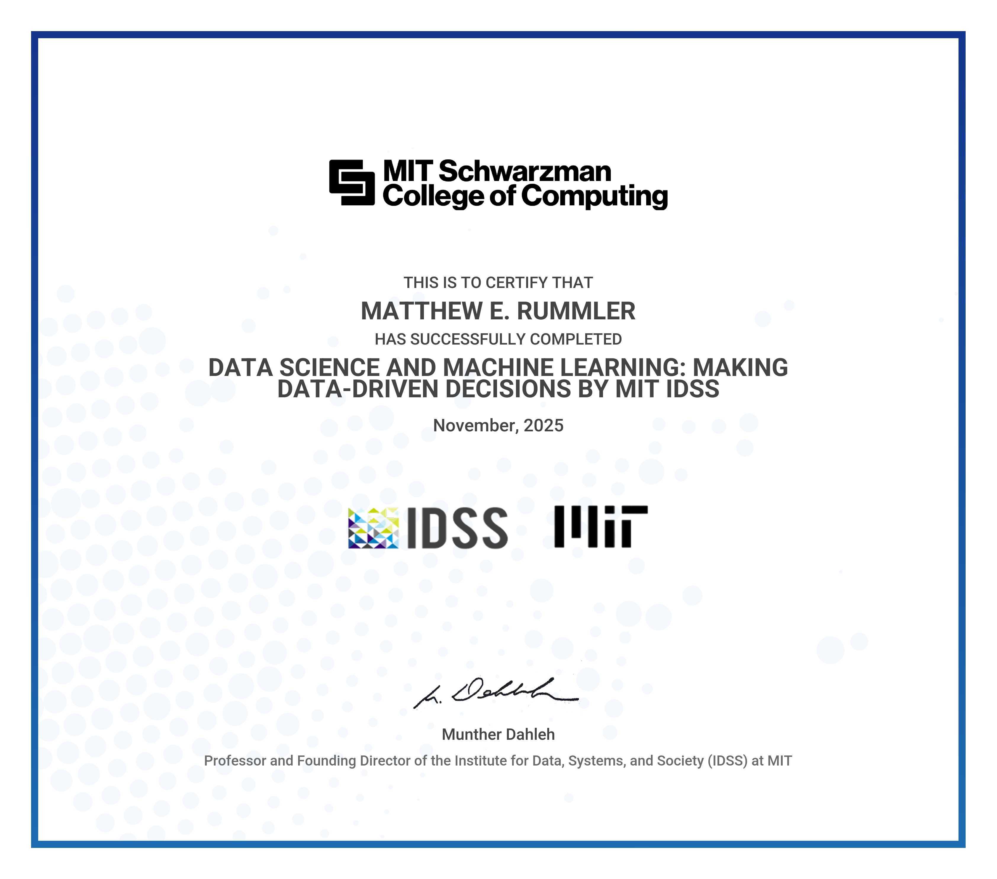 The certificate below verifies that MATTHEW E. RUMMLER has completed the DATA SCIENCE AND MACHINE LEARNING: MAKING DATA-DRIVEN DECISIONS BY MIT IDSS