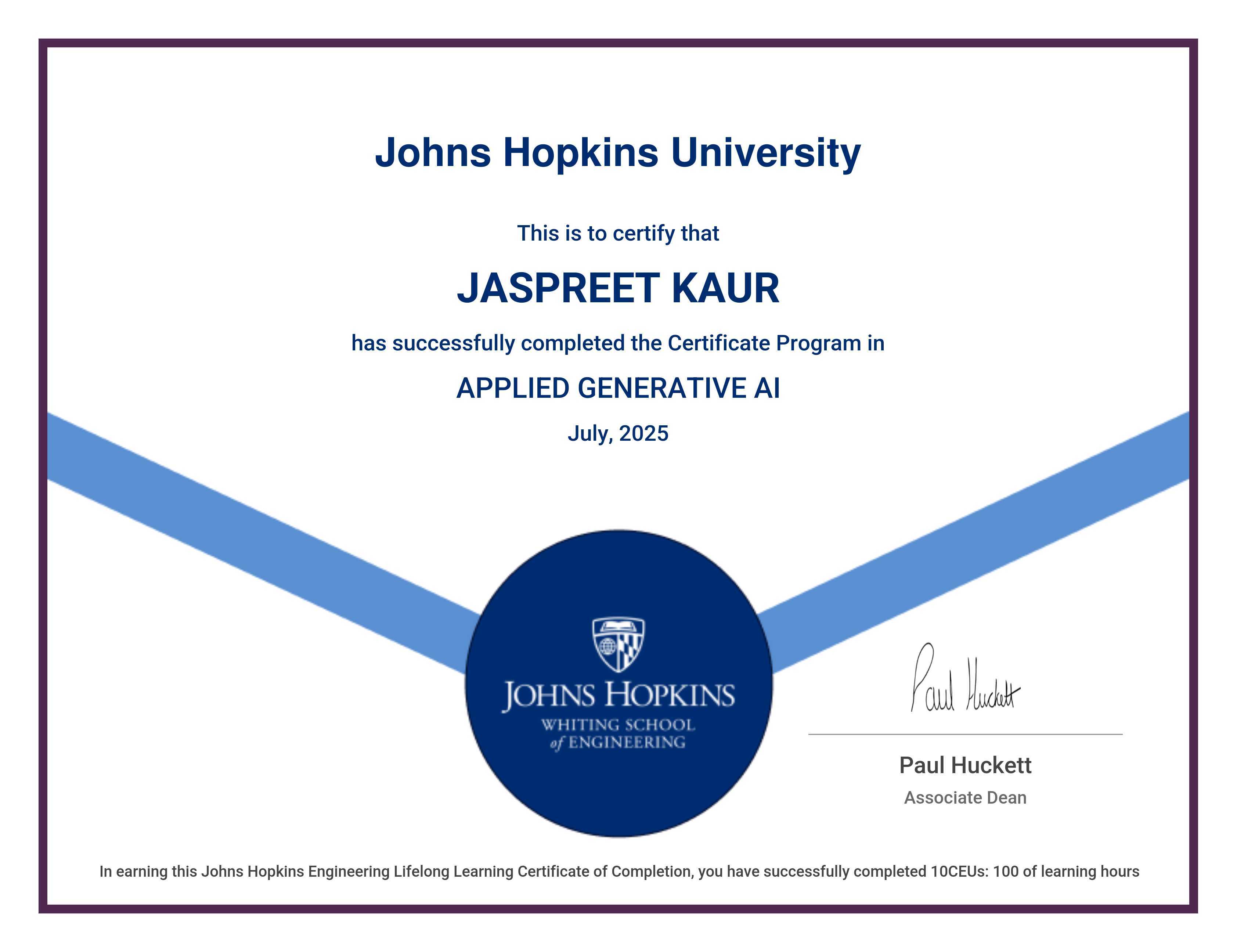 The certificate below verifies that JASPREET KAUR has completed the APPLIED GENERATIVE AI