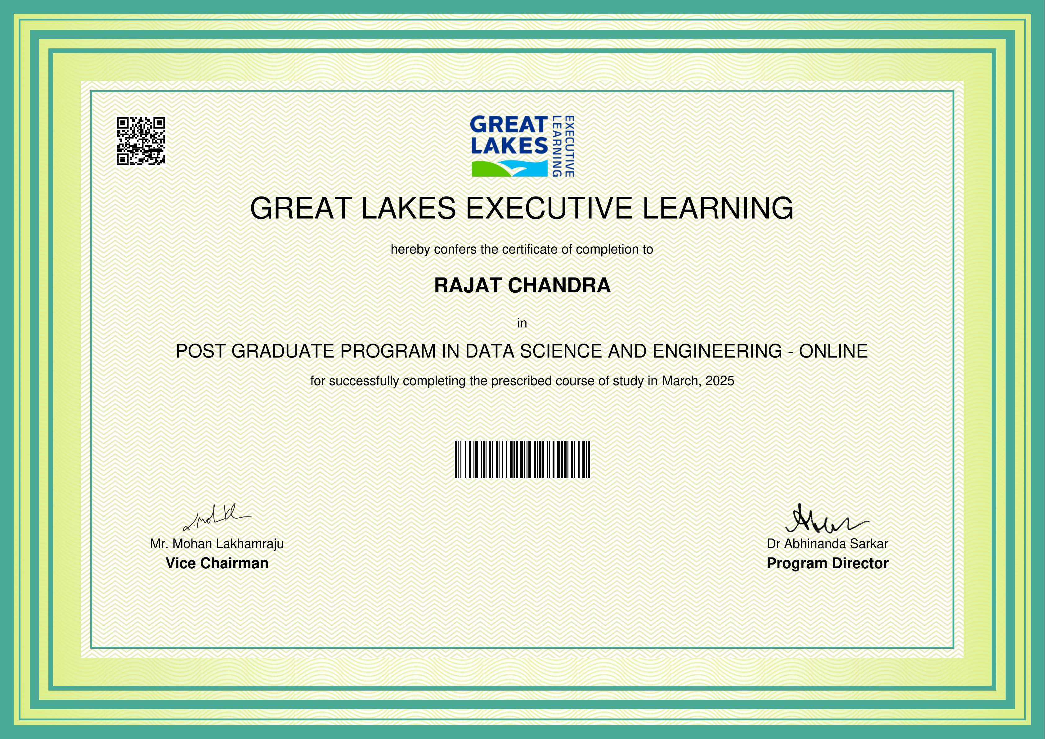 The certificate below verifies that RAJAT CHANDRA has completed the POST GRADUATE PROGRAM IN DATA SCIENCE AND ENGINEERING - ONLINE