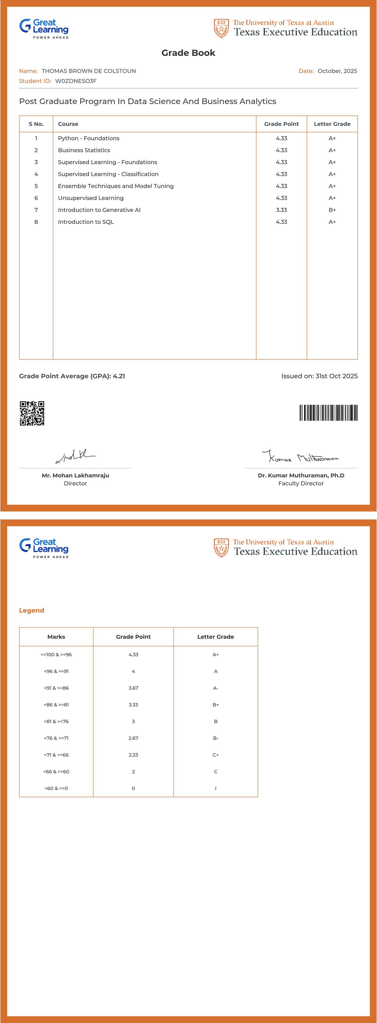 The grade sheet below verifies that THOMAS BROWN DE COLSTOUN has completed the POST GRADUATE PROGRAM IN DATA SCIENCE AND BUSINESS ANALYTICS