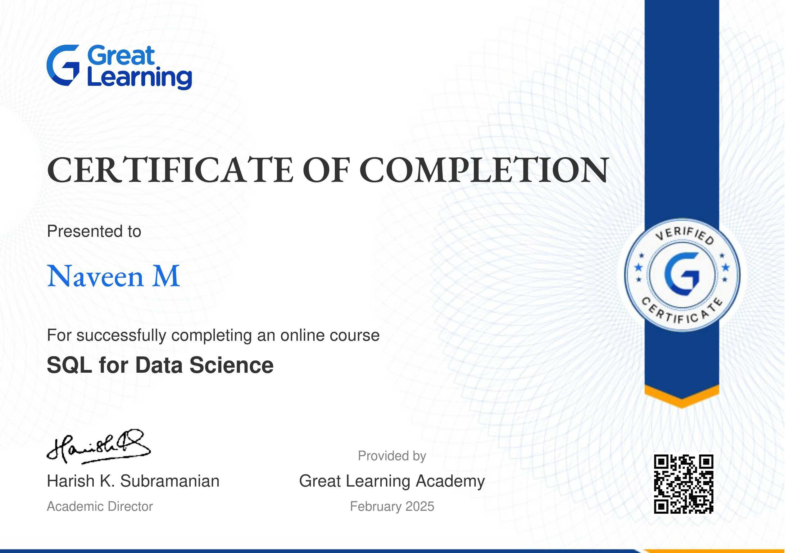 The certificate above verifies that Naveen M has successfully completed the course SQL for Data Science