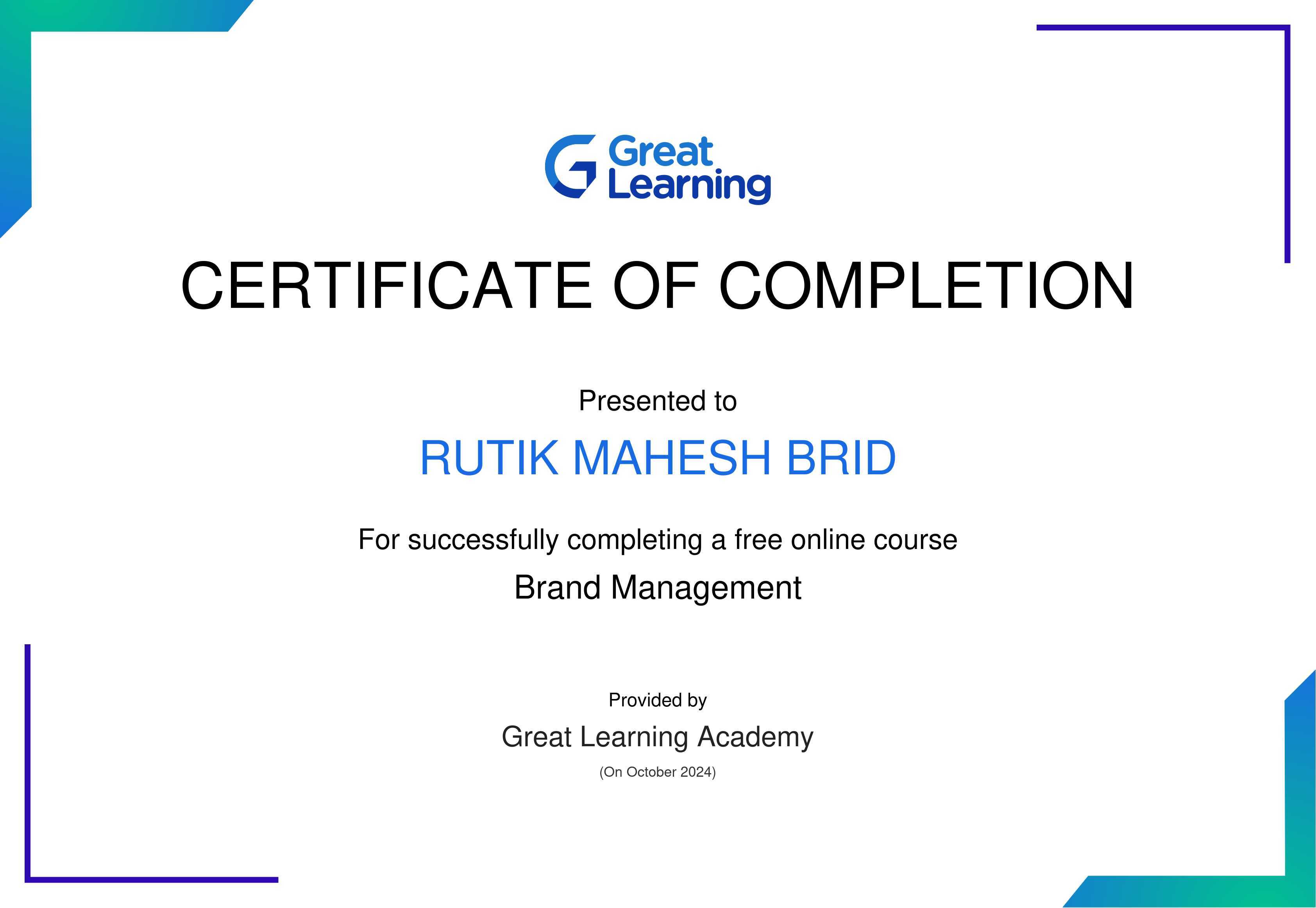 The certificate above verifies that Rutik Mahesh Brid has successfully completed the course Brand Management