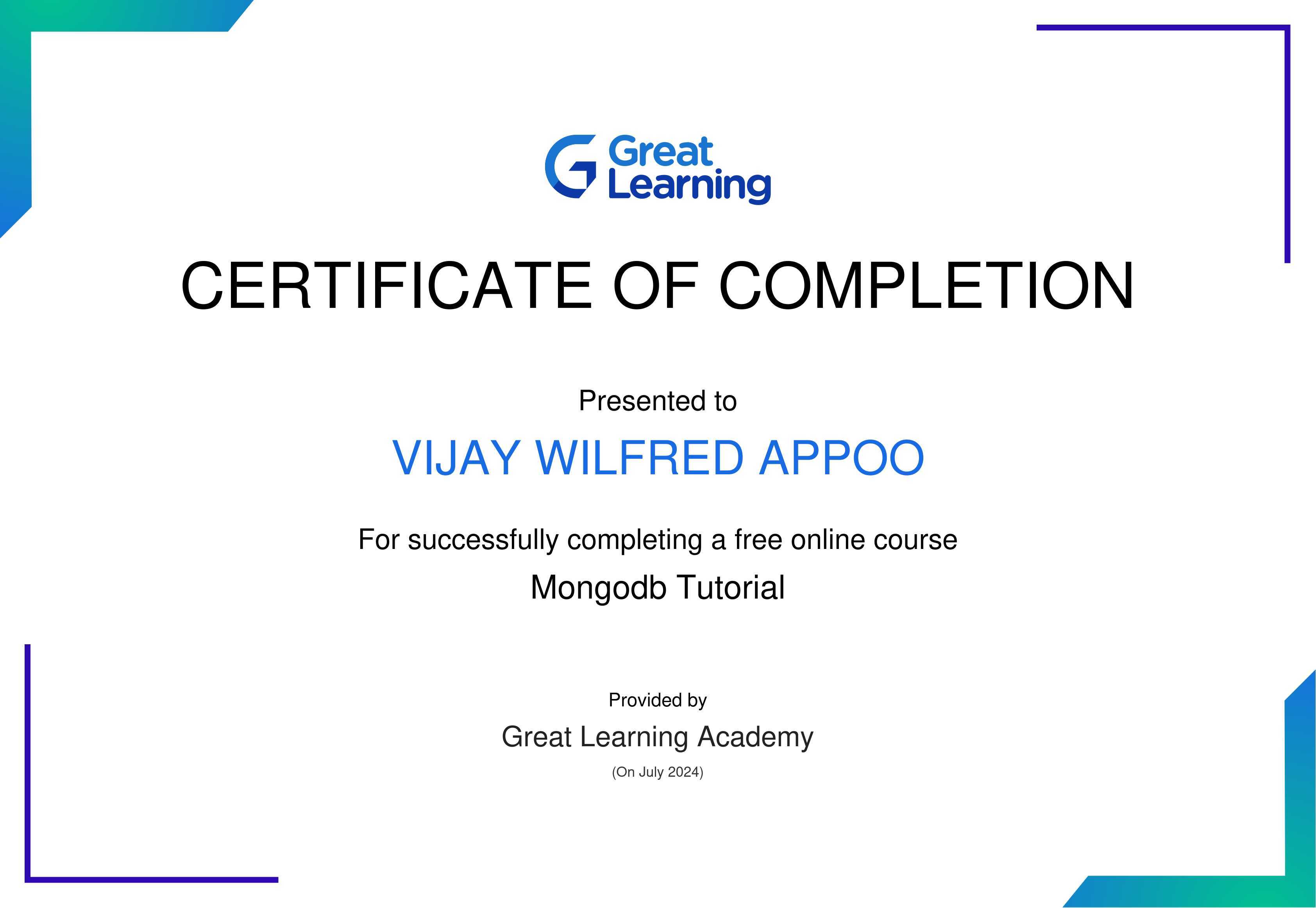 The certificate above verifies that Vijay Wilfred Appoo has successfully completed the course Mongodb Tutorial