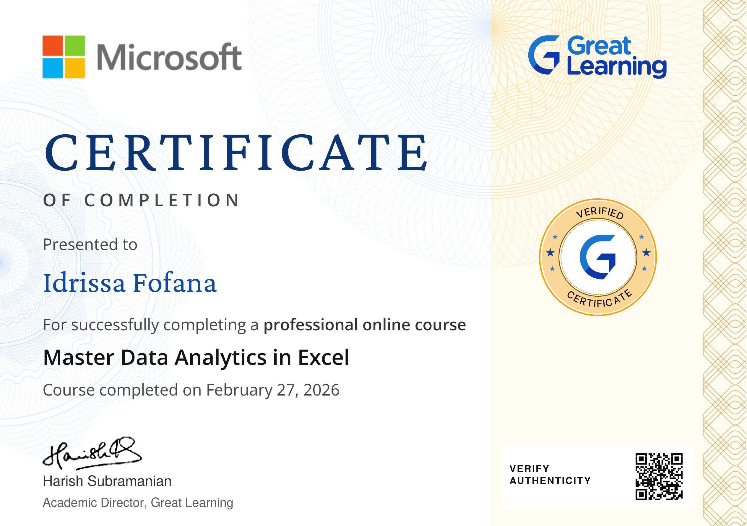 The certificate above verifies that Idrissa Fofana has successfully completed the course Master Data Analytics in Excel