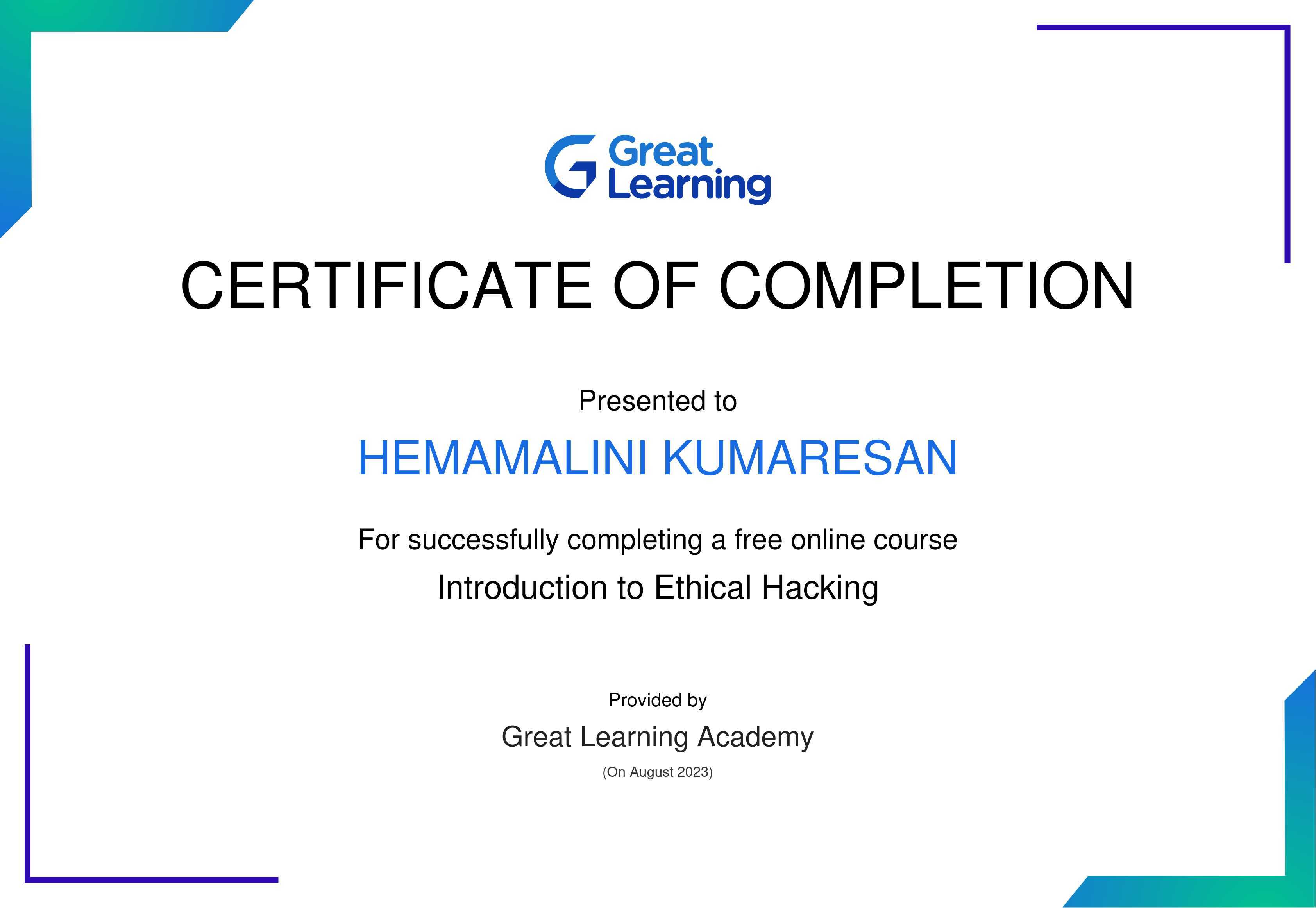 The certificate above verifies that Hemamalini Kumaresan has successfully completed the course Introduction to Ethical Hacking