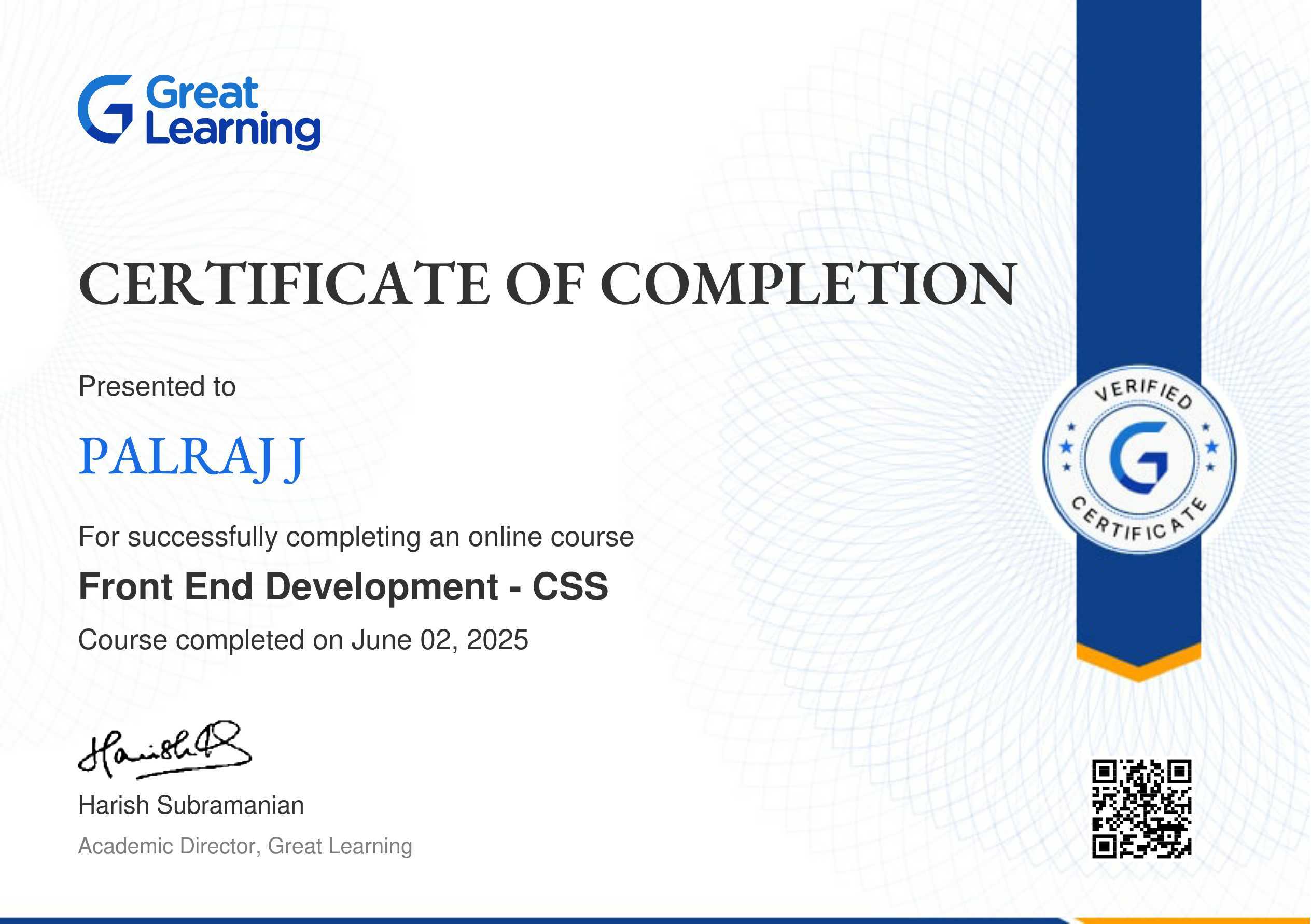 The certificate above verifies that Palraj J has successfully completed the course Front End Development - CSS