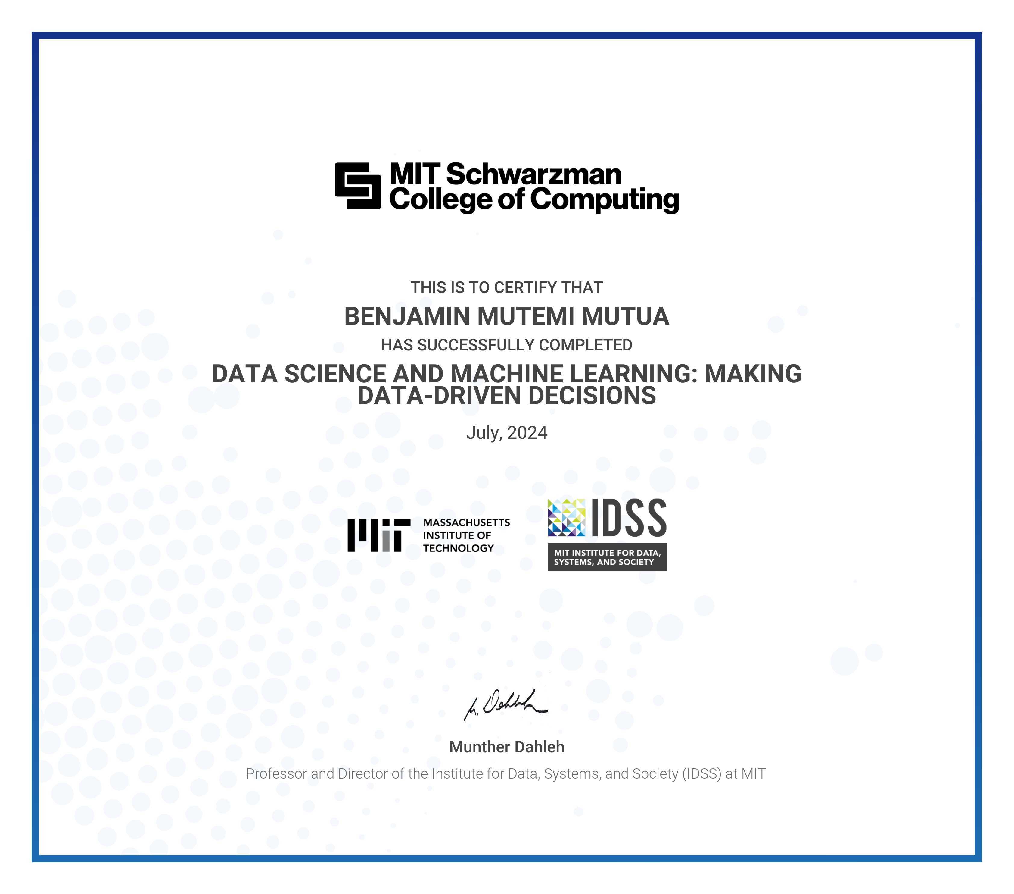 The certificate below verifies that BENJAMIN MUTEMI MUTUA has completed the DATA SCIENCE AND MACHINE LEARNING: MAKING DATA-DRIVEN DECISIONS