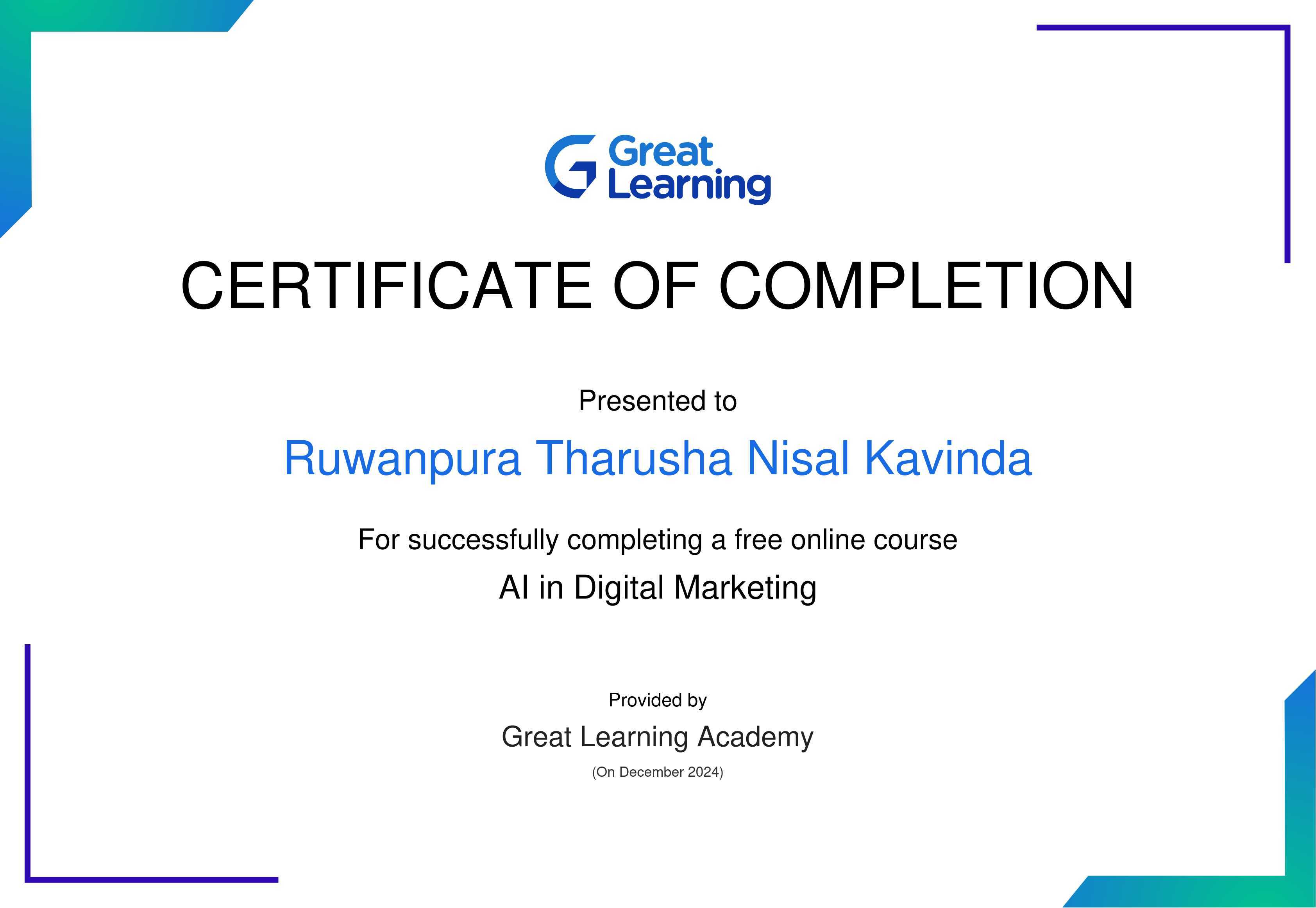 The certificate above verifies that Ruwanpura Tharusha Nisal Kavinda has successfully completed the course AI in Digital Marketing