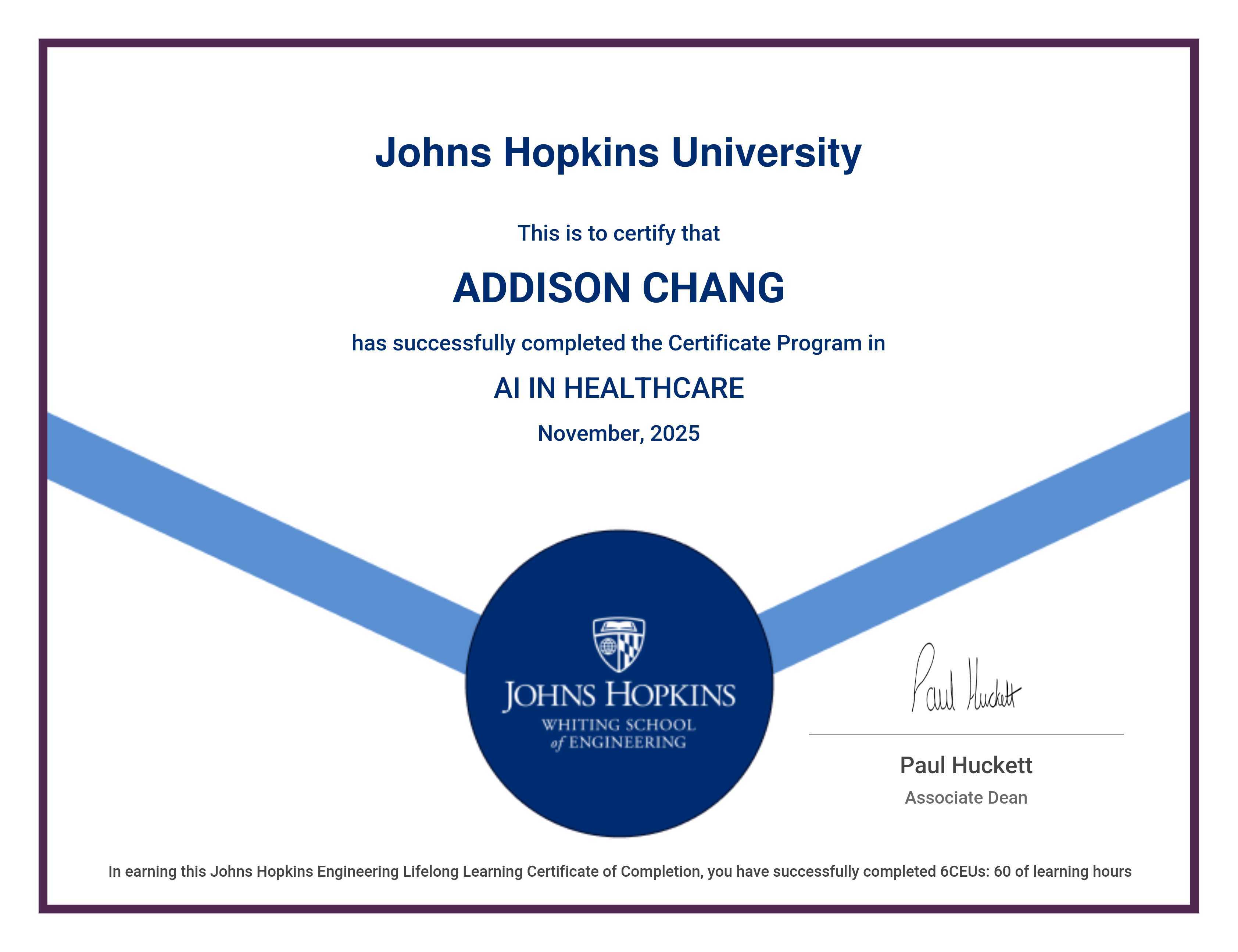 The certificate below verifies that ADDISON CHANG has completed the AI IN HEALTHCARE