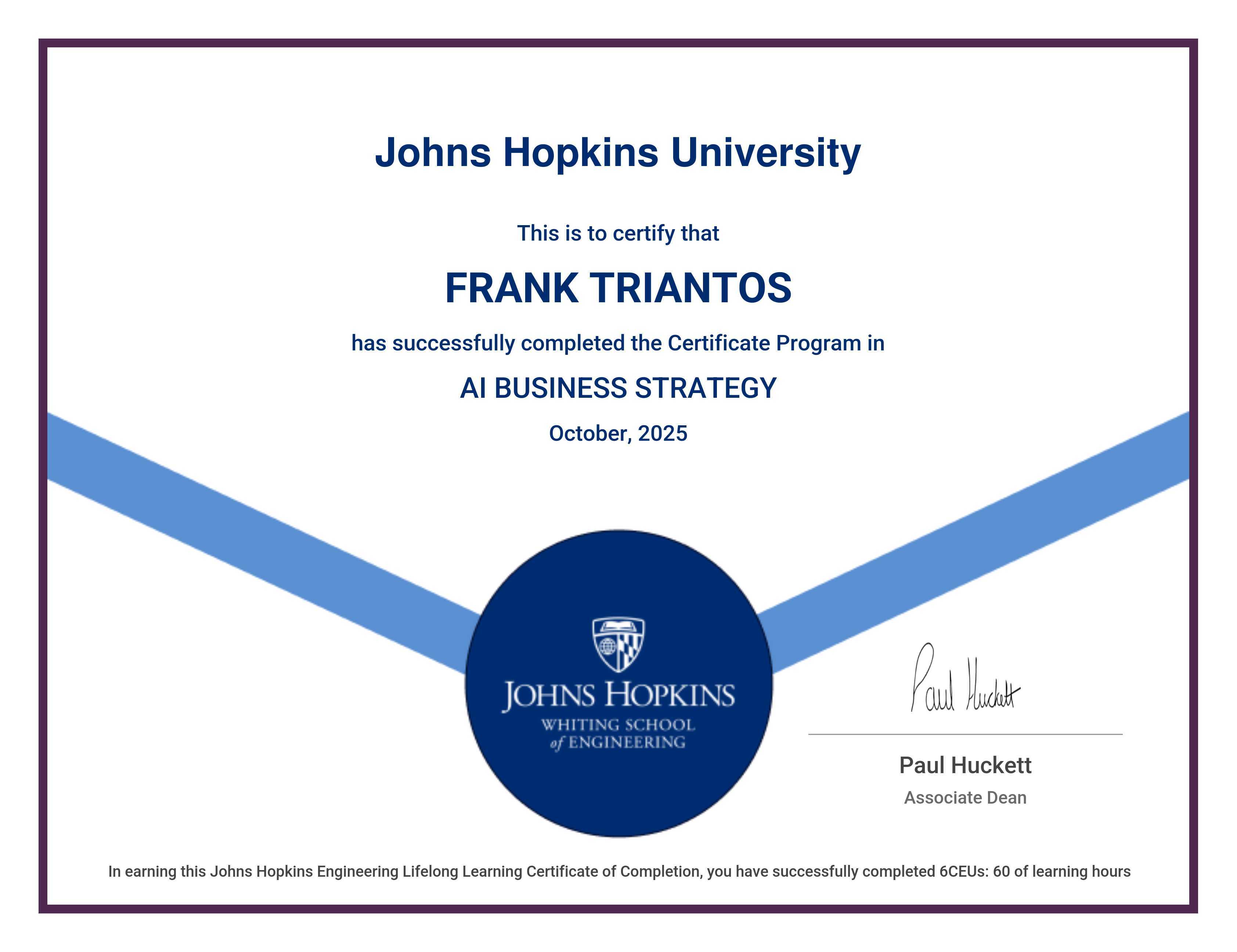 The certificate below verifies that FRANK TRIANTOS has completed the AI BUSINESS STRATEGY