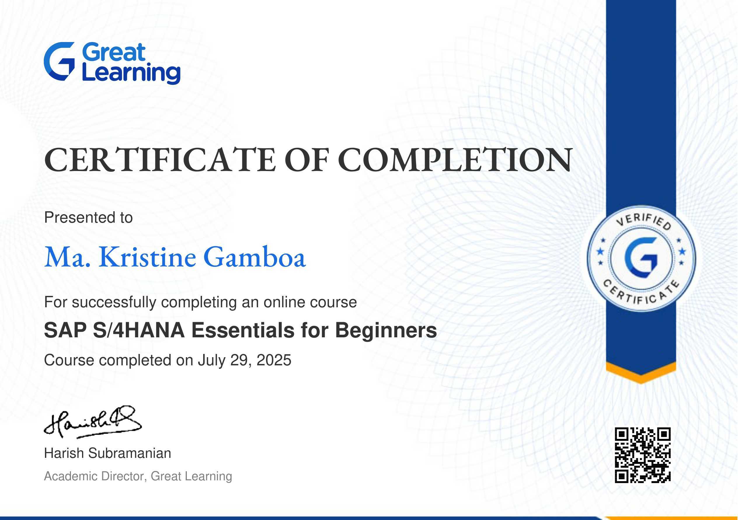 The certificate above verifies that Ma. Kristine Gamboa has successfully completed the course SAP S/4HANA Essentials for Beginners