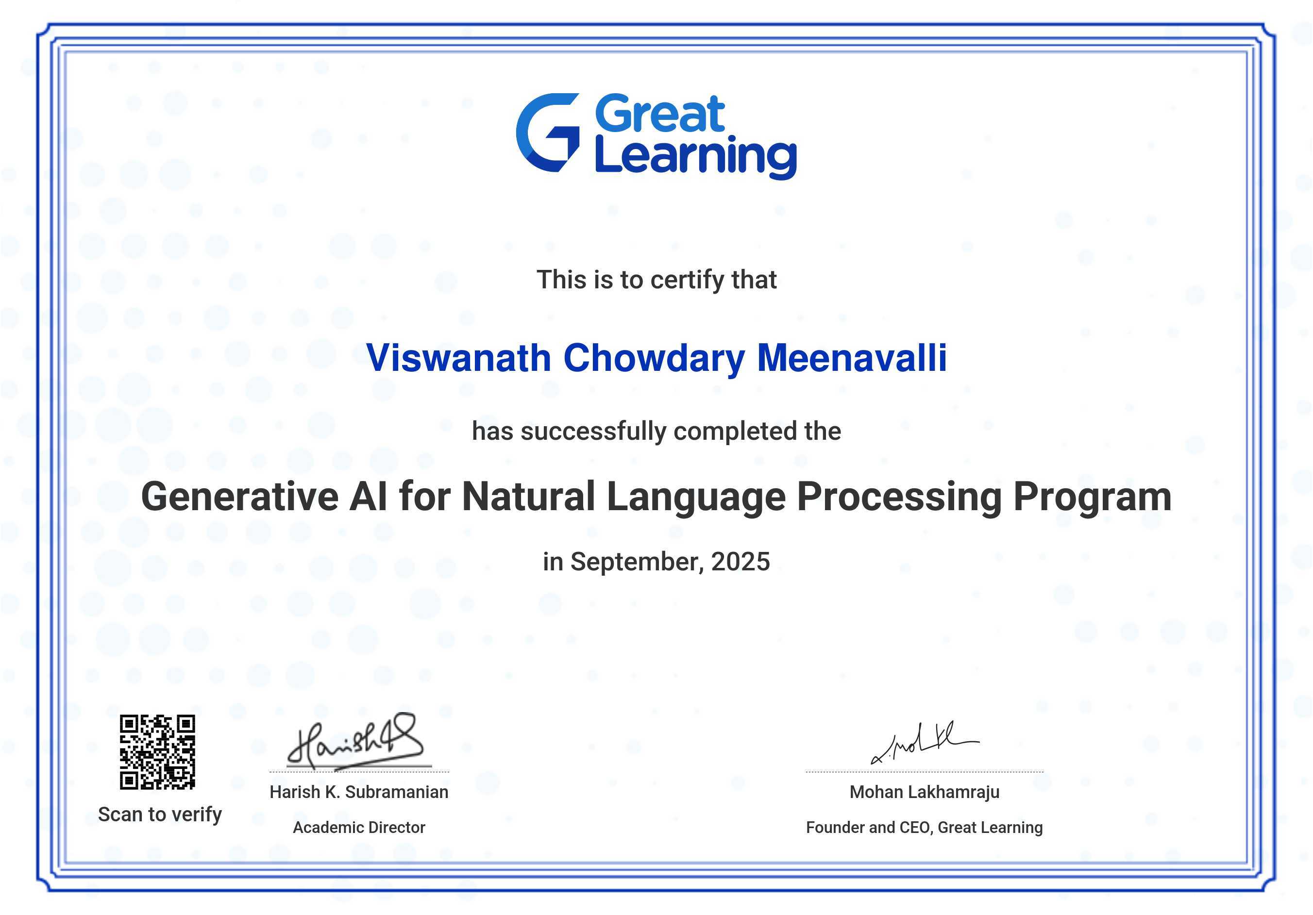The certificate below verifies that VISWANATH CHOWDARY MEENAVALLI has completed the GENERATIVE AI for NATURAL LANGUAGE PROCESSING PROGRAM