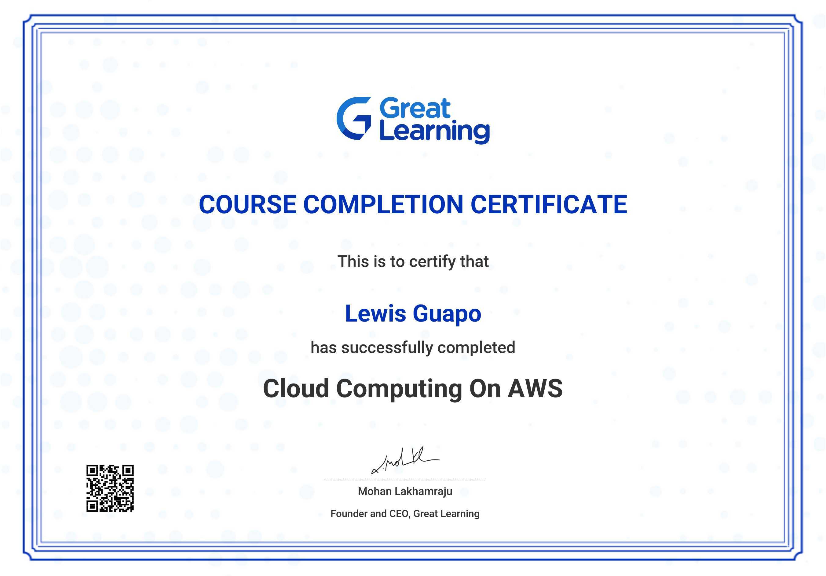 The certificate below verifies that Lewis Guapo has completed the Cloud Computing on AWS course