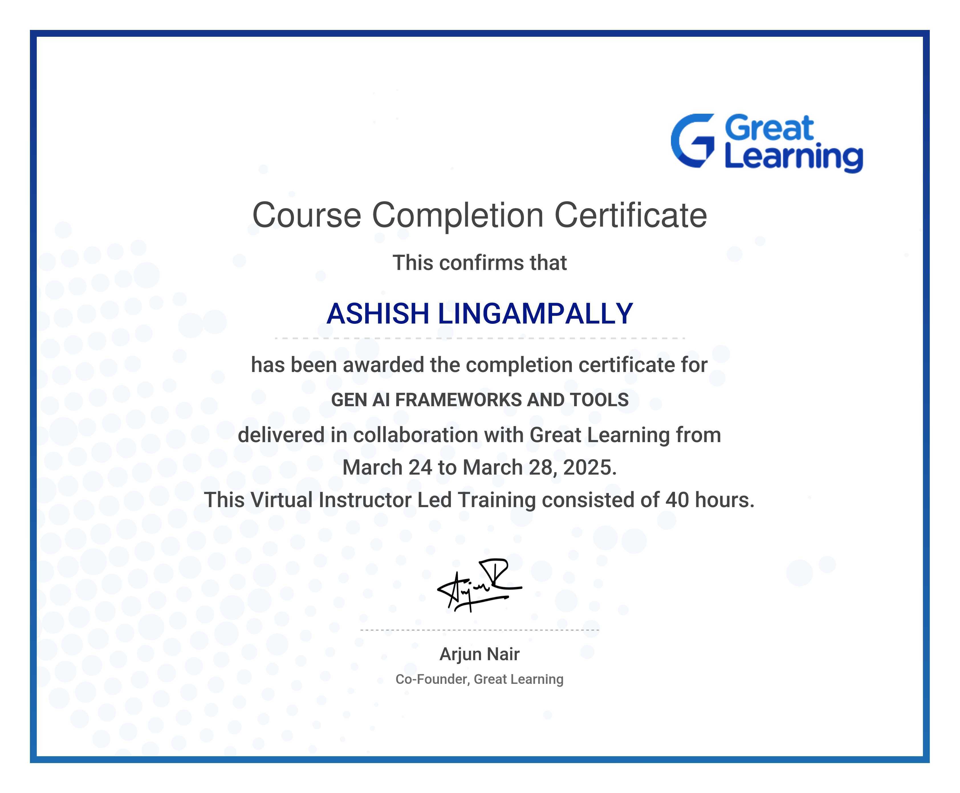 The certificate below verifies that ASHISH LINGAMPALLY has completed the GEN AI FRAMEWORKS AND TOOLS