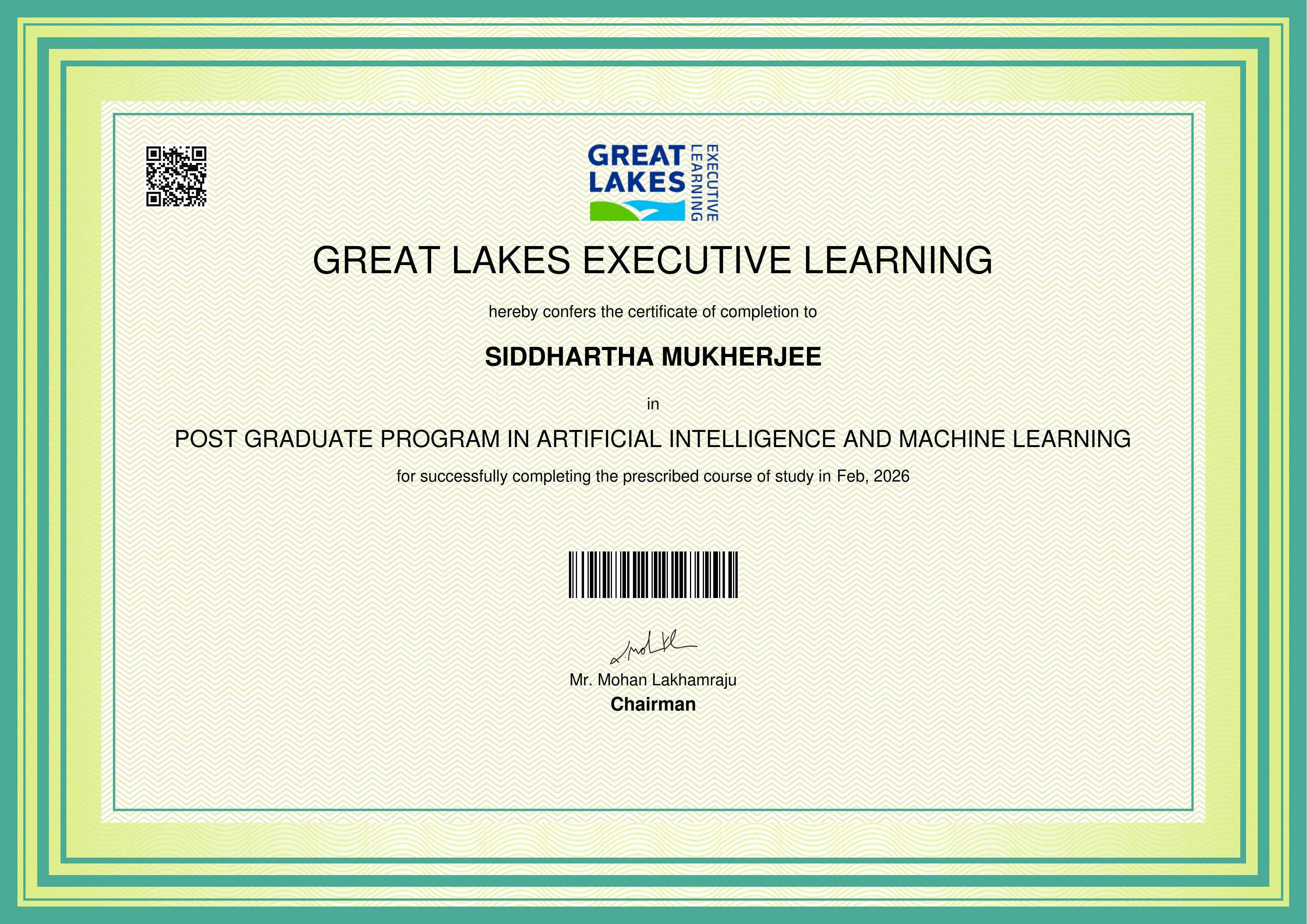 The certificate below verifies that SIDDHARTHA MUKHERJEE has completed the POST GRADUATE PROGRAM IN ARTIFICIAL INTELLIGENCE AND MACHINE LEARNING
