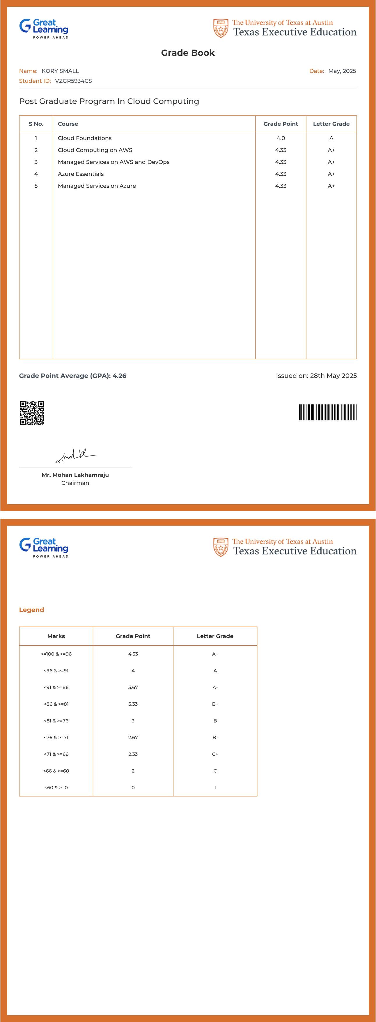 The grade sheet below verifies that KORY SMALL has completed the POST GRADUATE PROGRAM IN CLOUD COMPUTING