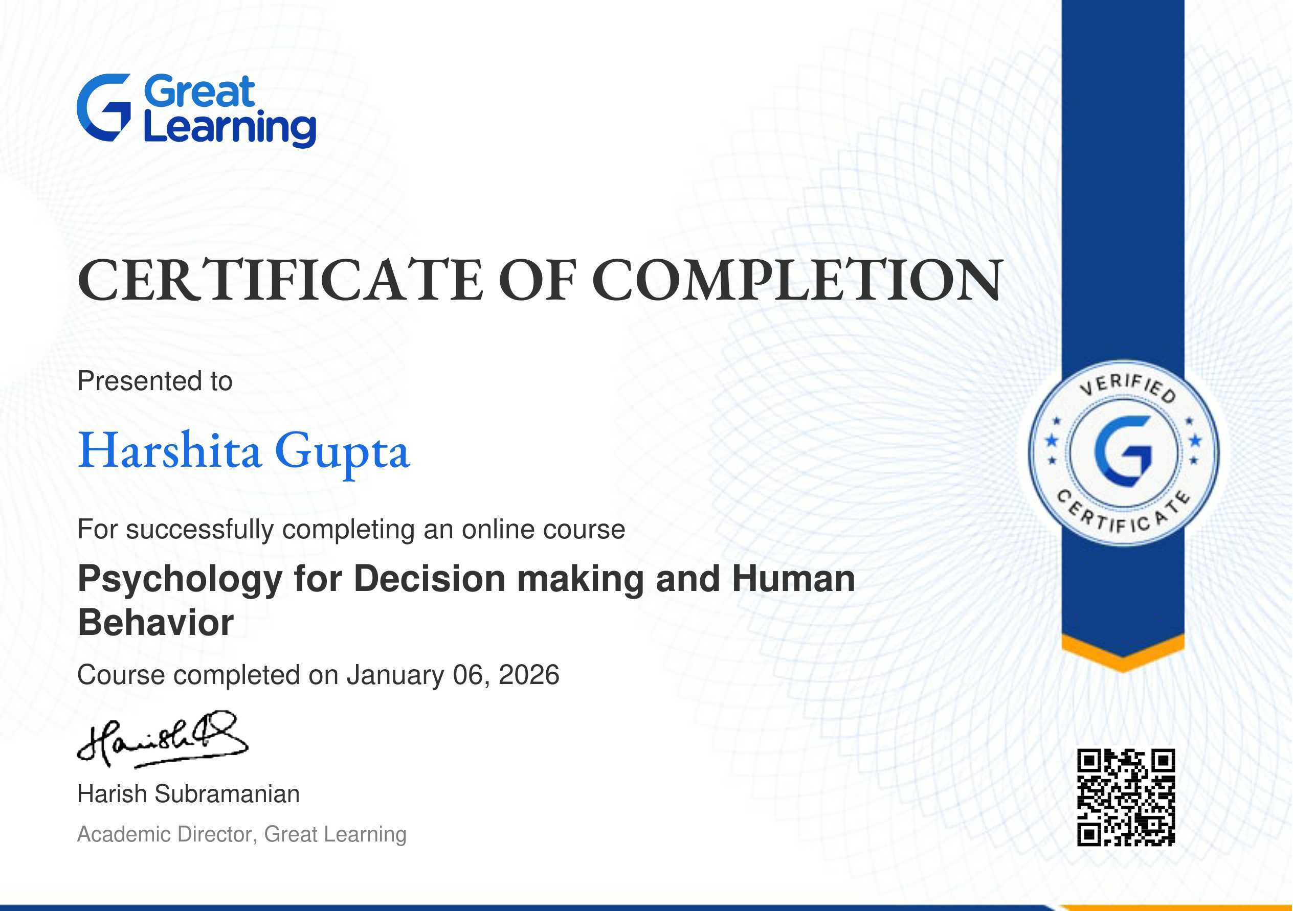 The certificate above verifies that Harshita Gupta has successfully completed the course Psychology for Decision making and Human Behavior