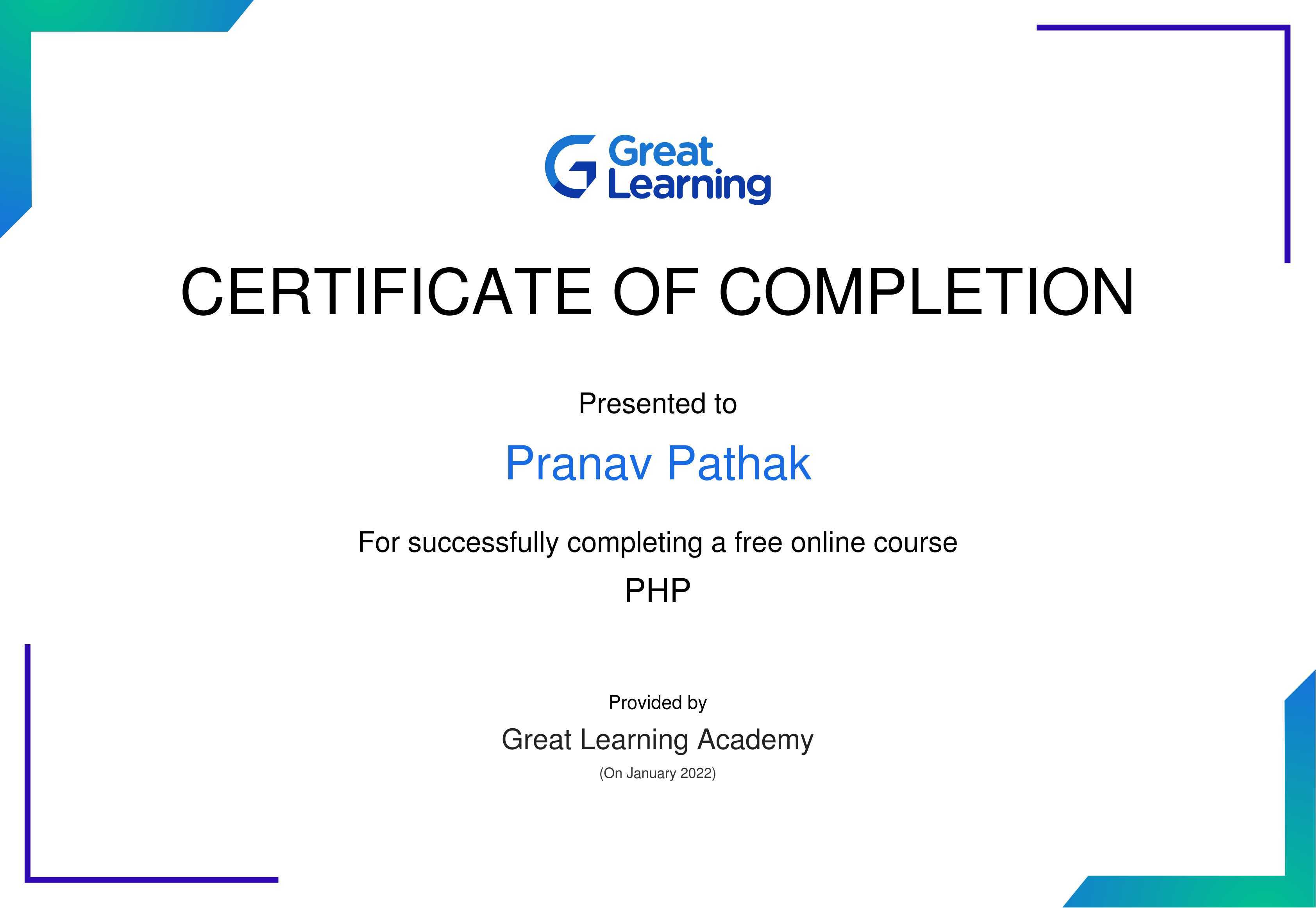 The certificate above verifies that Pranav Pathak has successfully completed the course PHP for Beginners