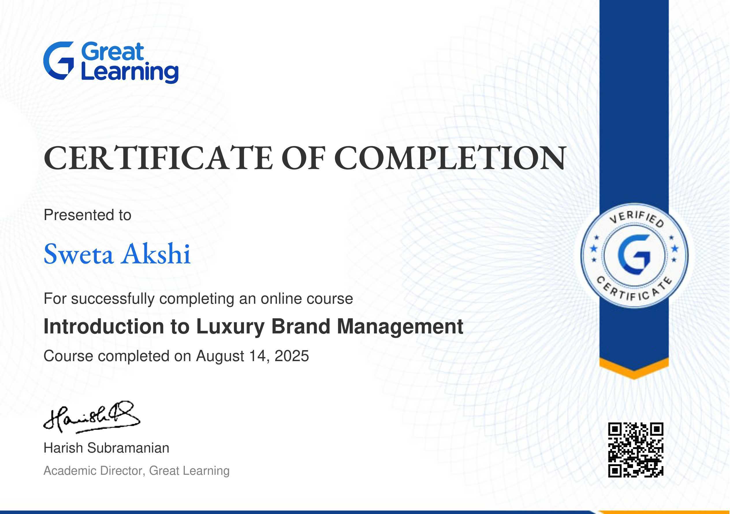 The certificate above verifies that Sweta Akshi has successfully completed the course Introduction to Luxury Brand Management