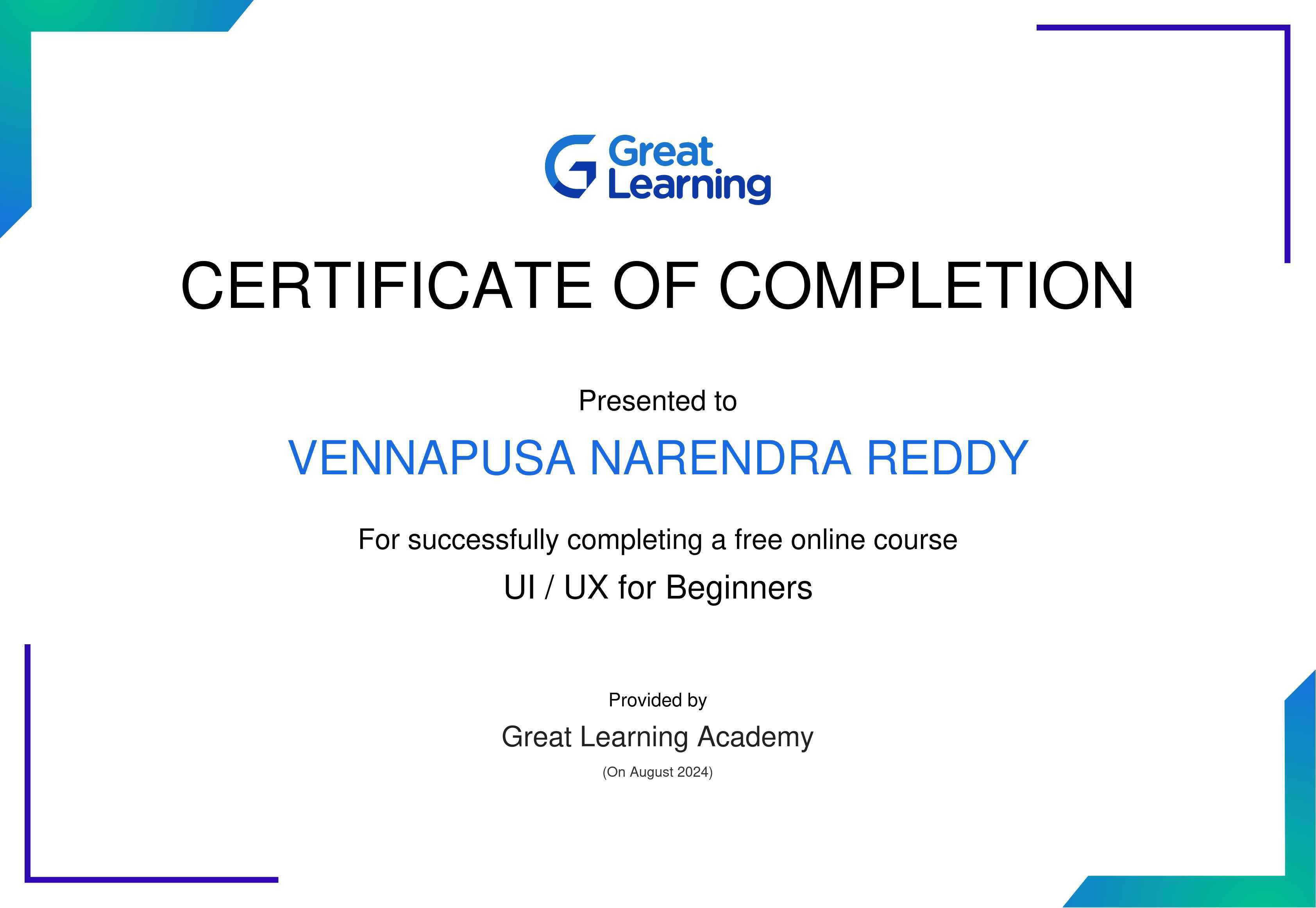 The certificate above verifies that Vennapusa Narendra Reddy has successfully completed the course UI / UX for Beginners