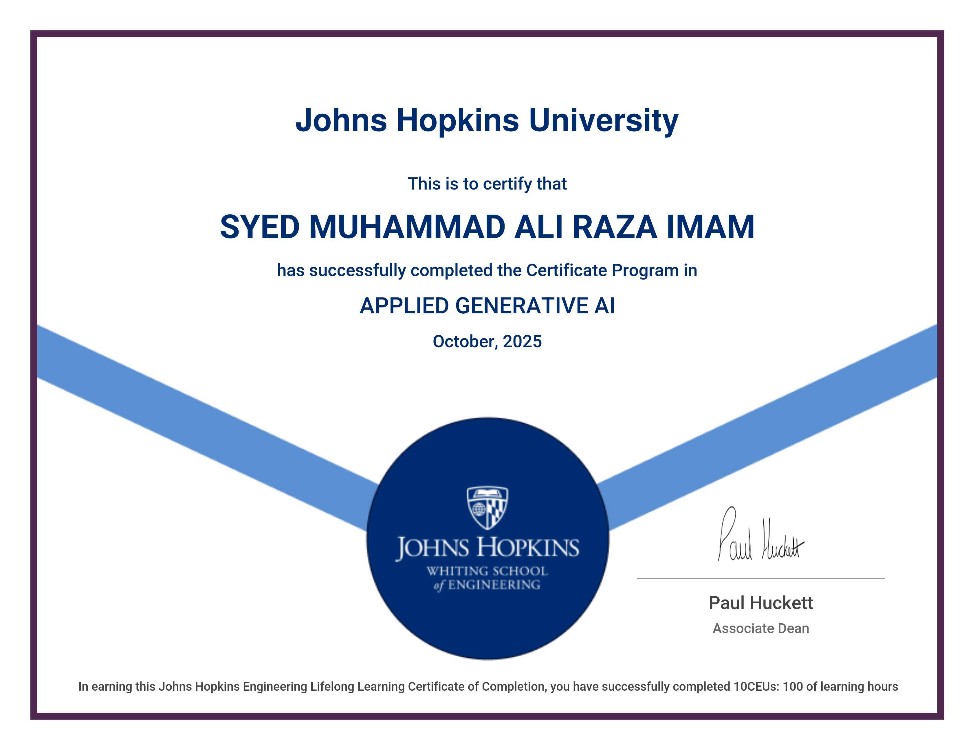 The certificate below verifies that SYED MUHAMMAD ALI RAZA IMAM has completed the APPLIED GENERATIVE AI