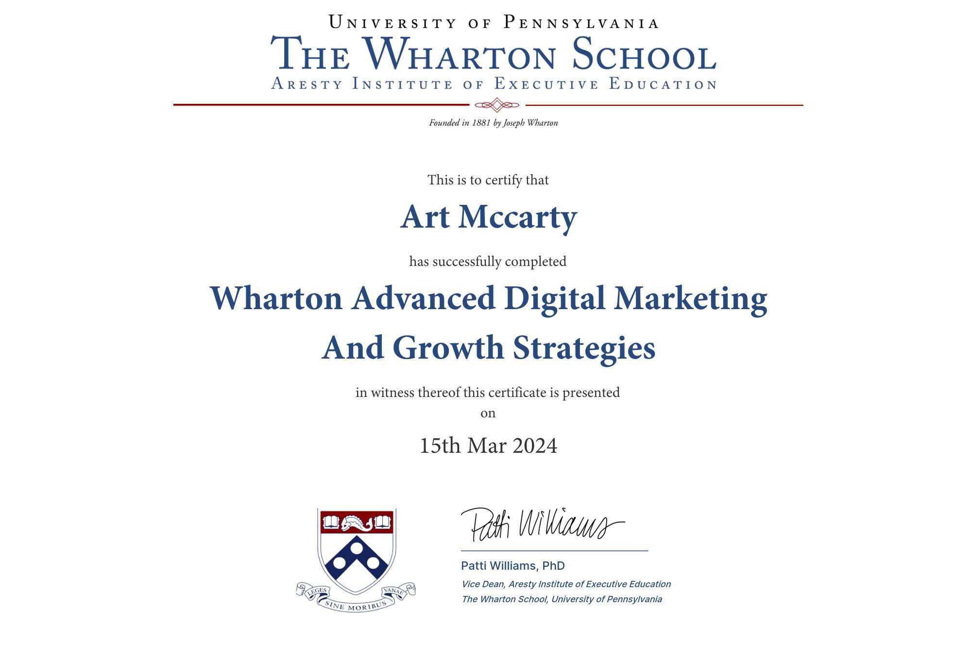 The certificate below verifies that ART MCCARTY has completed the WHARTON ADVANCED DIGITAL MARKETING AND GROWTH STRATEGIES