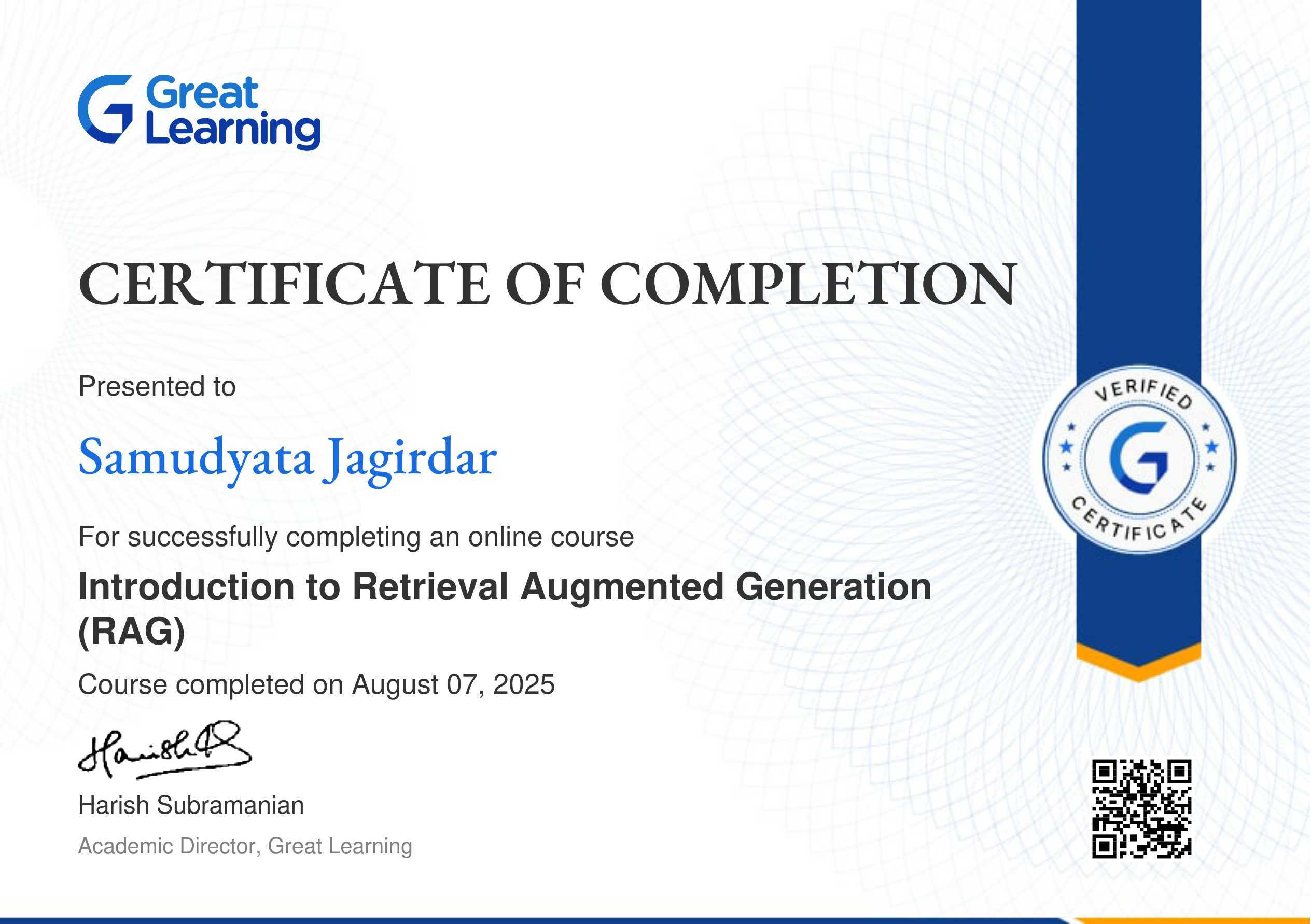 The certificate above verifies that Samudyata Sudarshan Jagirdar has successfully completed the course Introduction to RAG