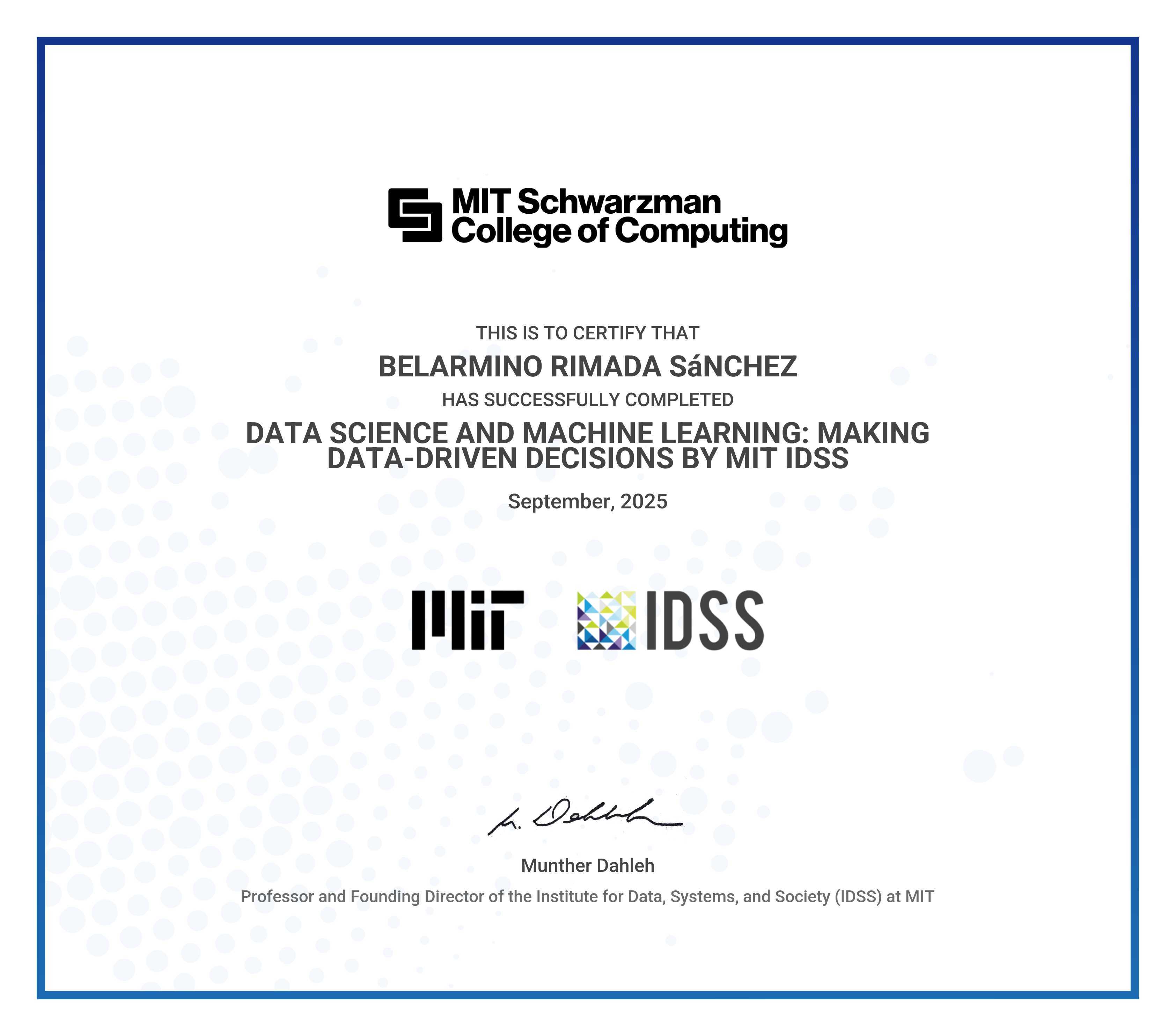 The certificate below verifies that BELARMINO RIMADA SáNCHEZ has completed the DATA SCIENCE AND MACHINE LEARNING: MAKING DATA-DRIVEN DECISIONS BY MIT IDSS