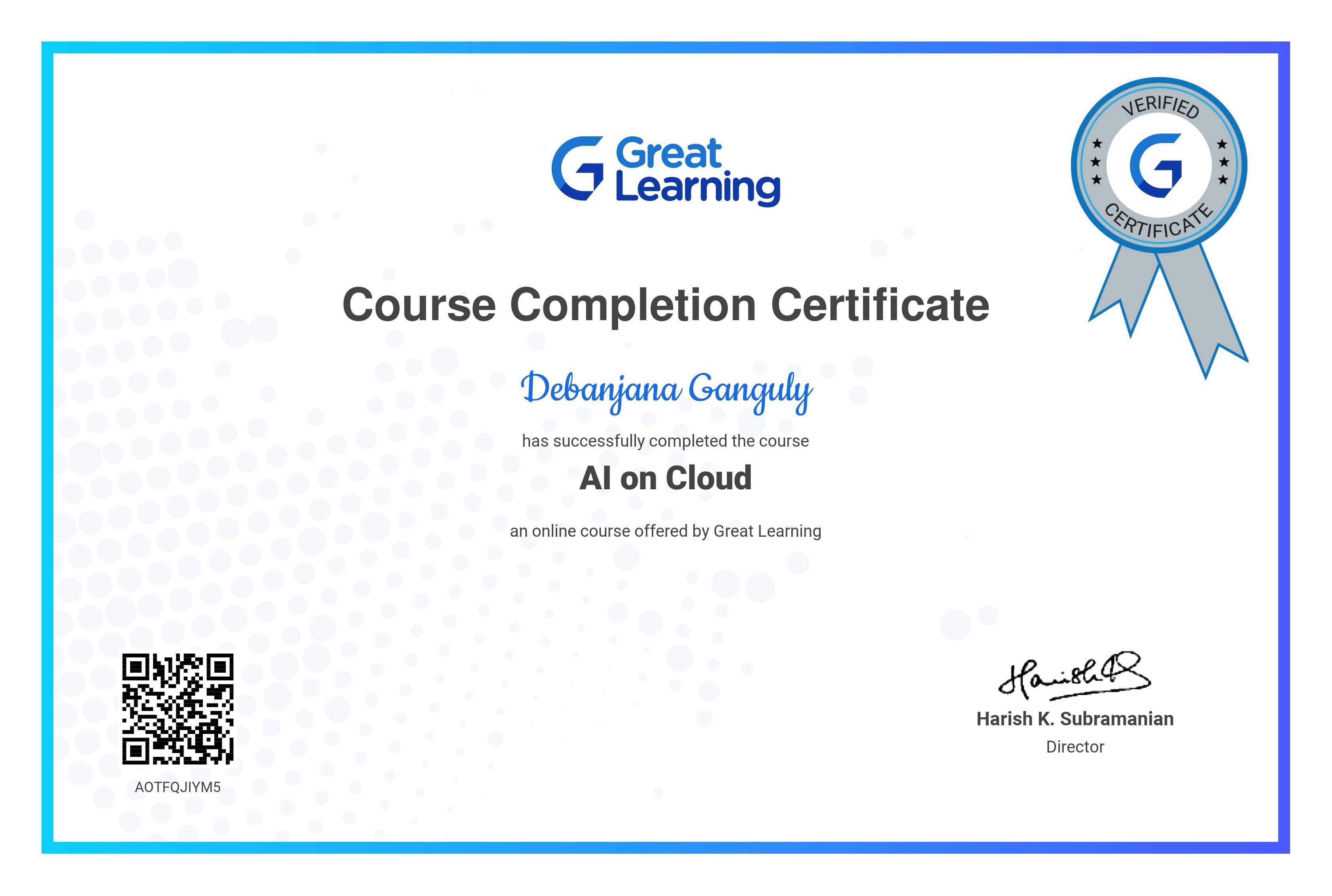 The certificate above verifies that Debanjana Ganguly has successfully completed the course AI on Cloud