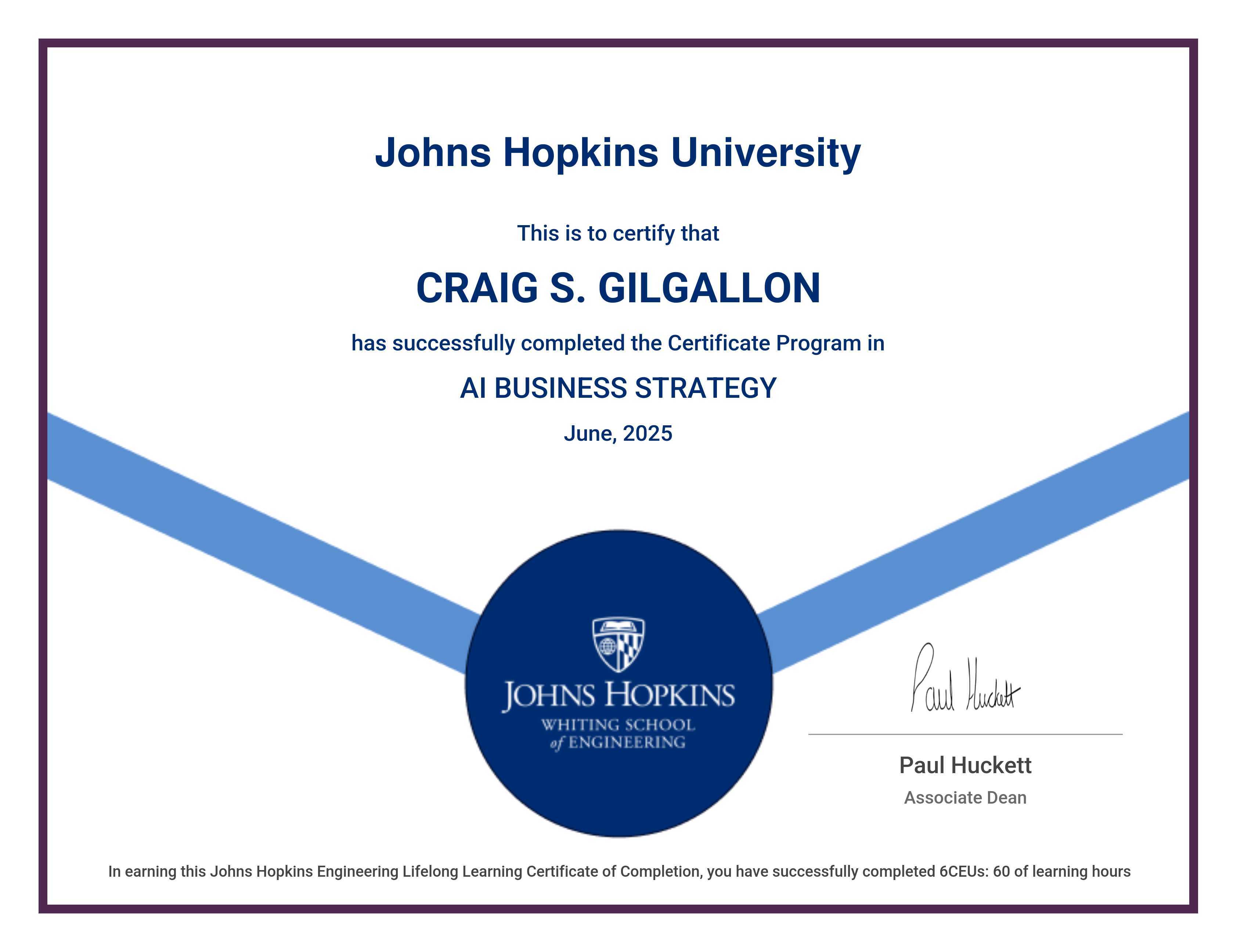 The certificate below verifies that CRAIG S. GILGALLON has completed the AI BUSINESS STRATEGY