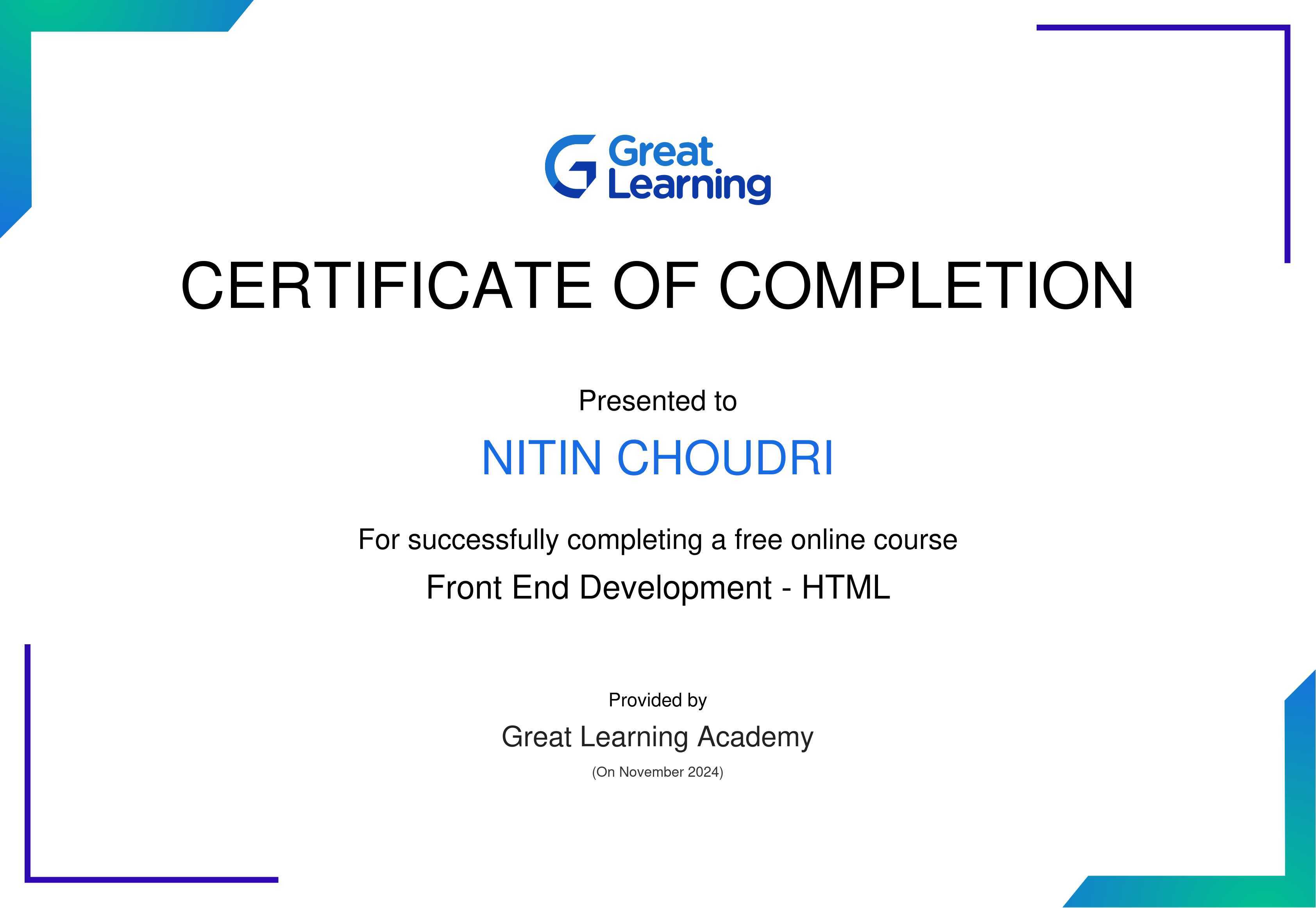 The certificate above verifies that Nitin Choudri has successfully completed the course Front End Development - HTML