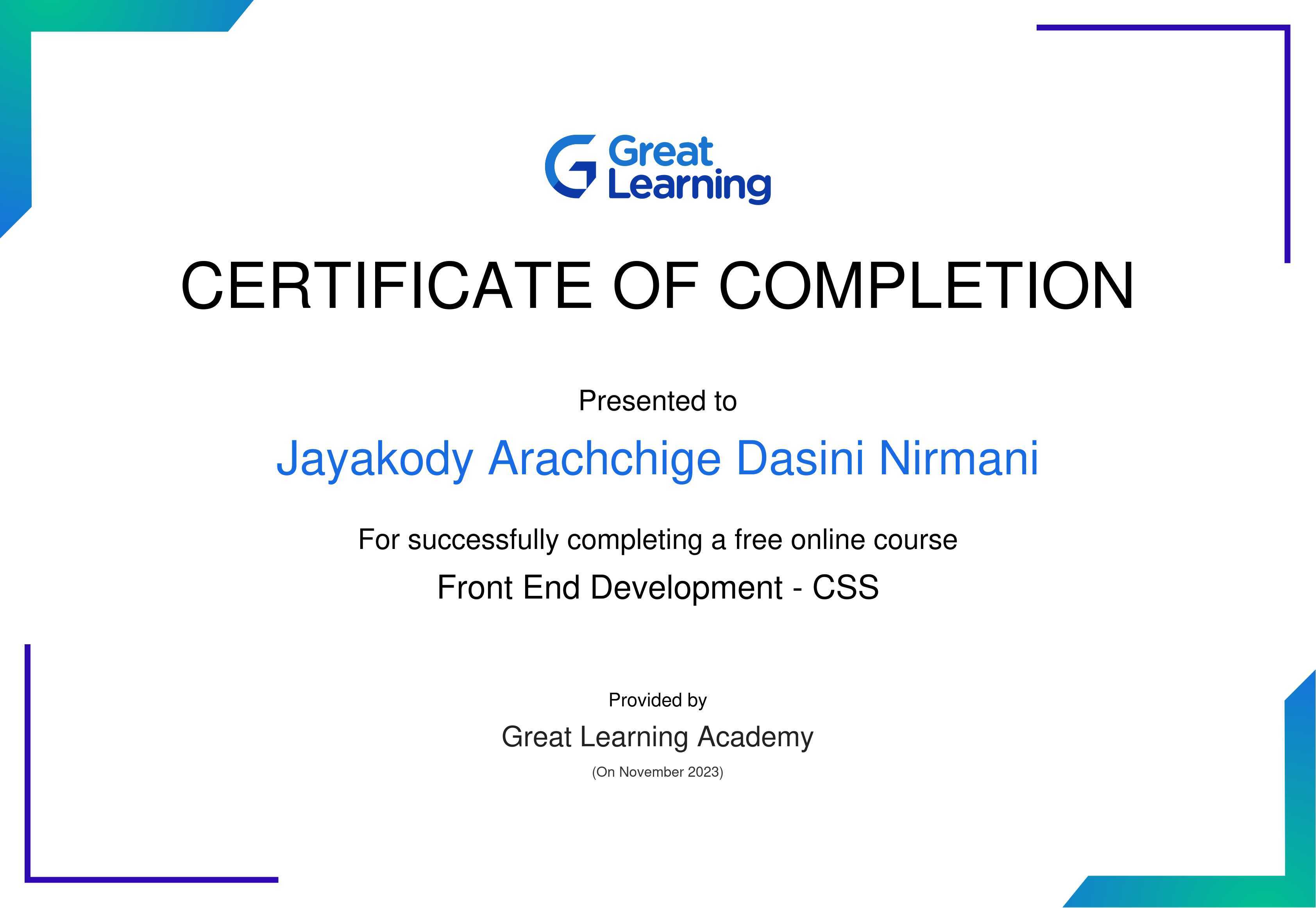 The certificate above verifies that J.A. Dasini Nirmani has successfully completed the course Front End Development - CSS