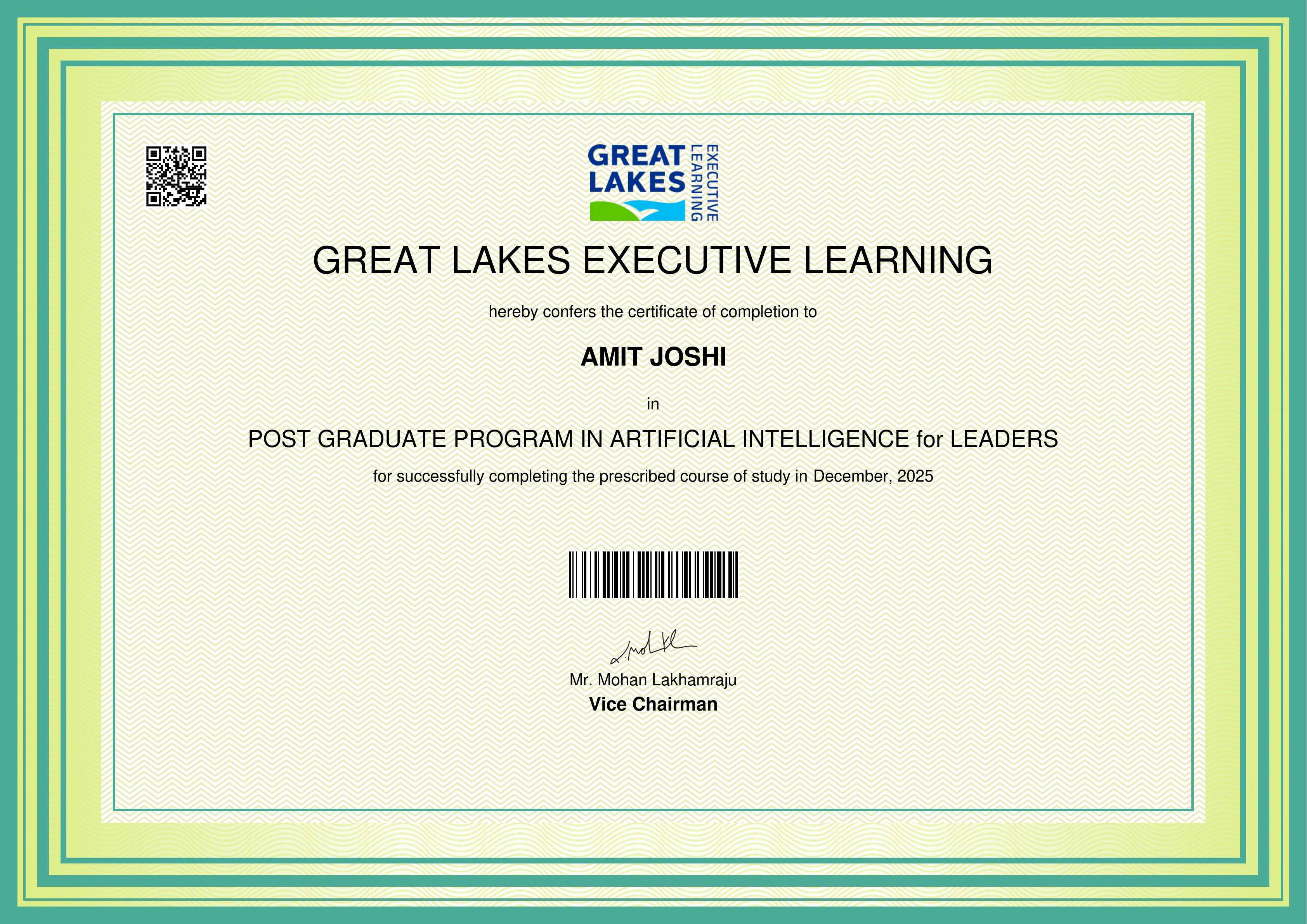The certificate below verifies that AMIT JOSHI has completed the POST GRADUATE PROGRAM IN ARTIFICIAL INTELLIGENCE for LEADERS