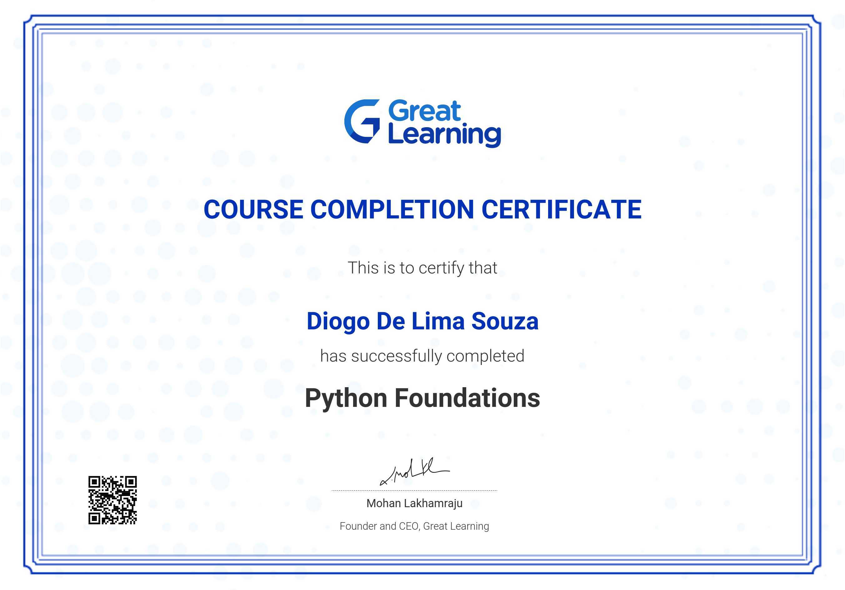 The certificate below verifies that Diogo De Lima Souza has completed the Python Foundations course