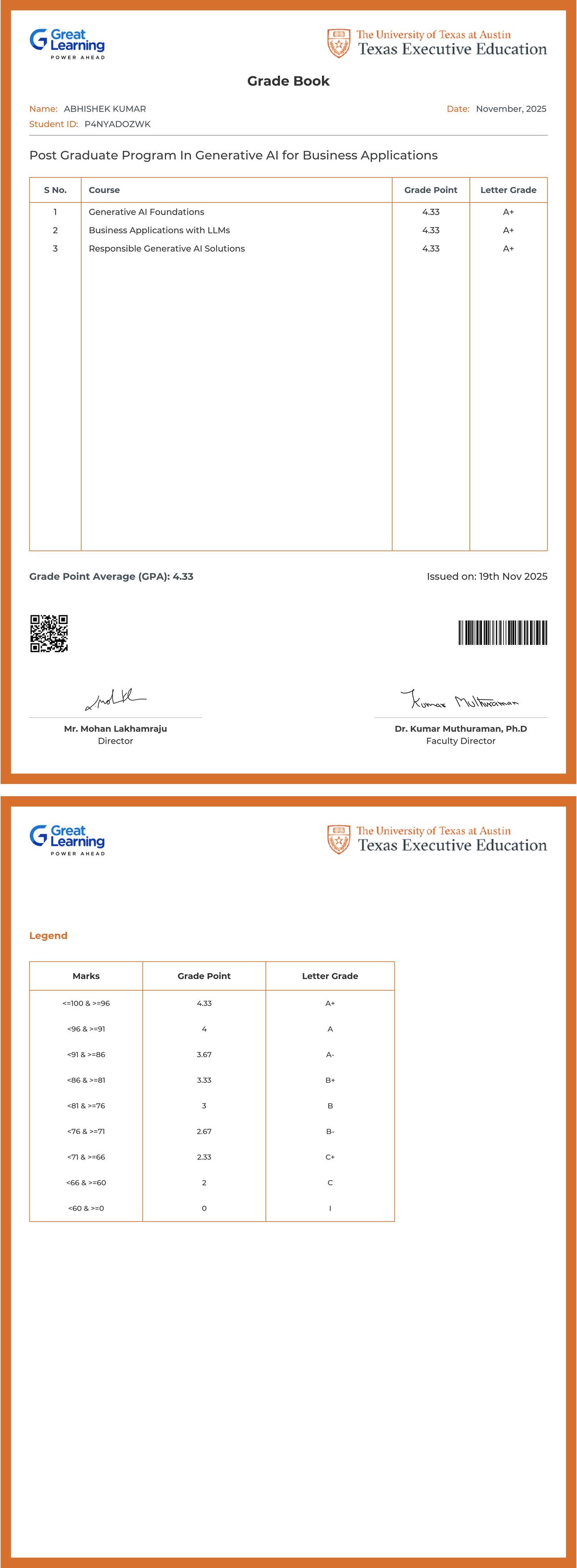 The grade sheet below verifies that ABHISHEK KUMAR has completed the POST GRADUATE PROGRAM IN GENERATIVE AI for BUSINESS APPLICATIONS