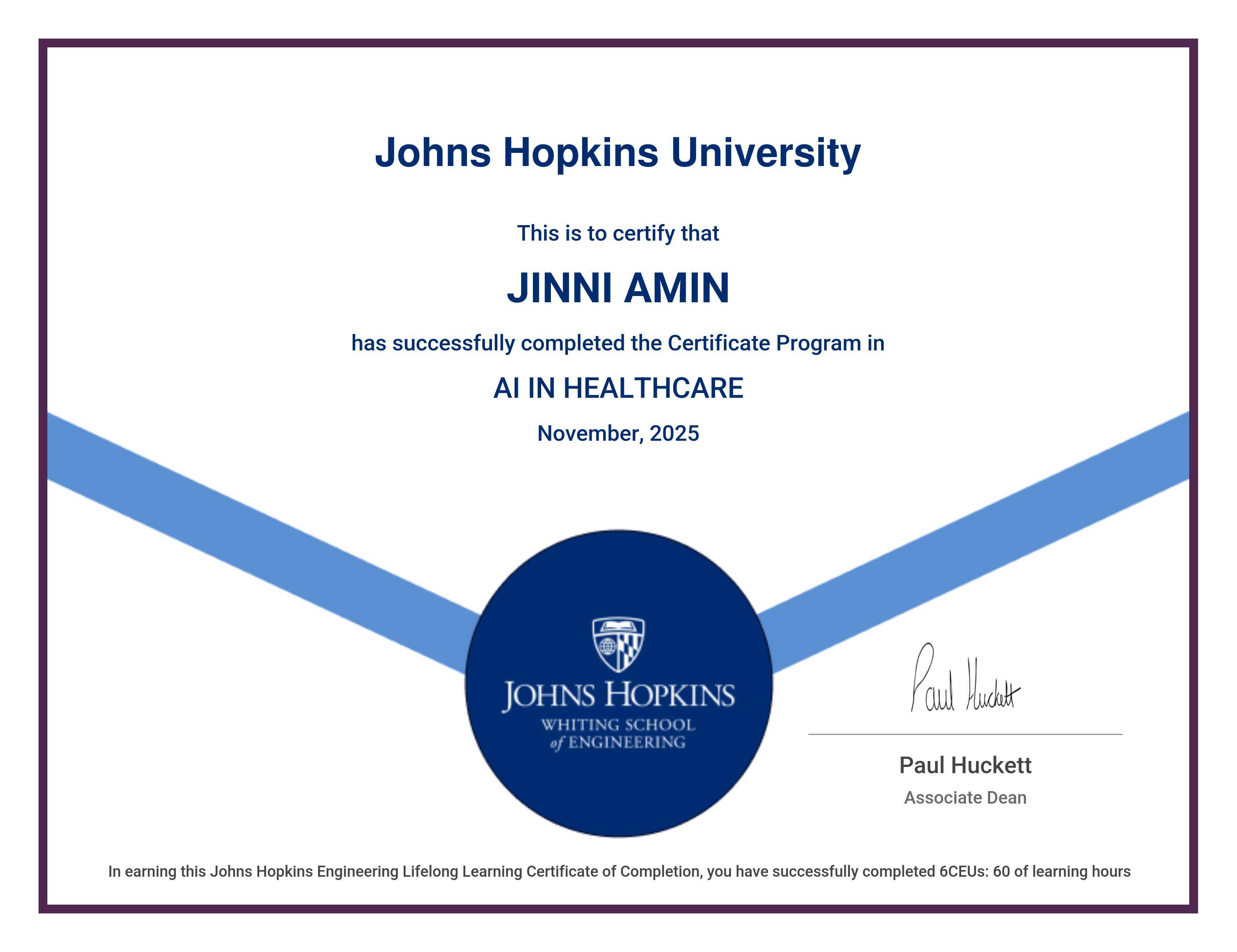The certificate below verifies that JINNI AMIN has completed the AI IN HEALTHCARE