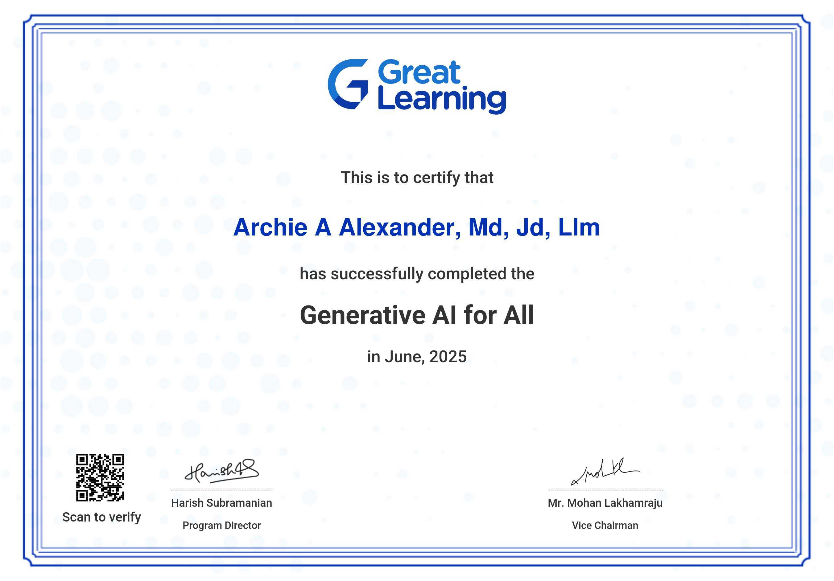 The certificate below verifies that ARCHIE A ALEXANDER, MD, JD, LLM has completed the GENERATIVE AI for ALL