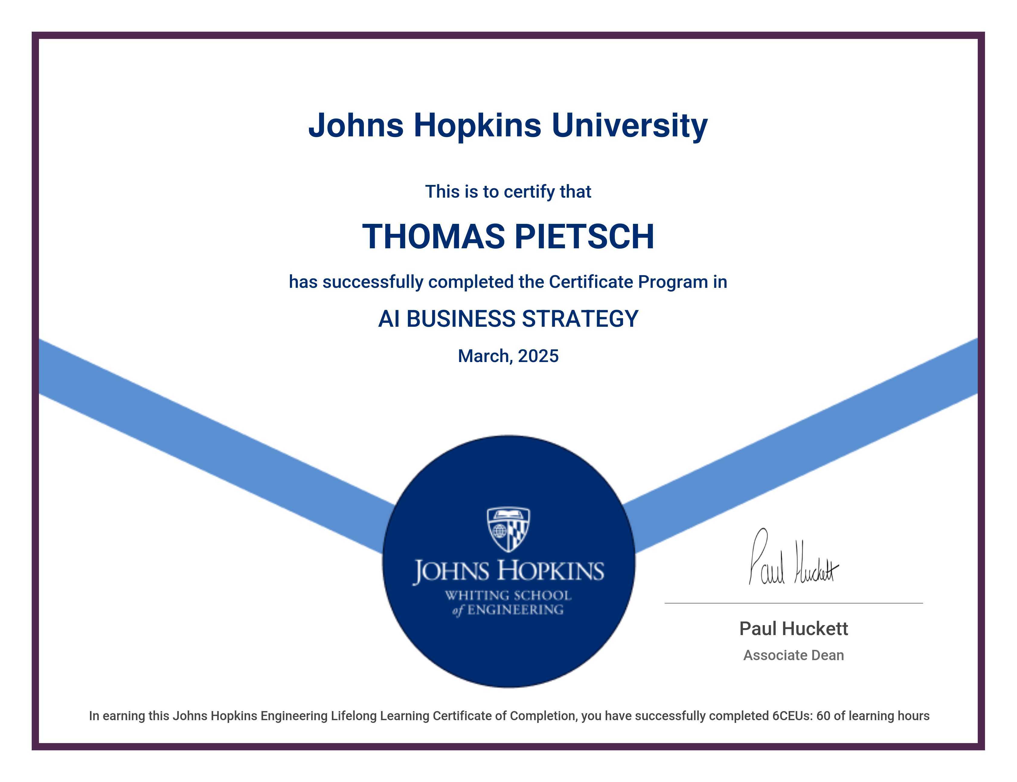 The certificate below verifies that THOMAS PIETSCH has completed the AI BUSINESS STRATEGY