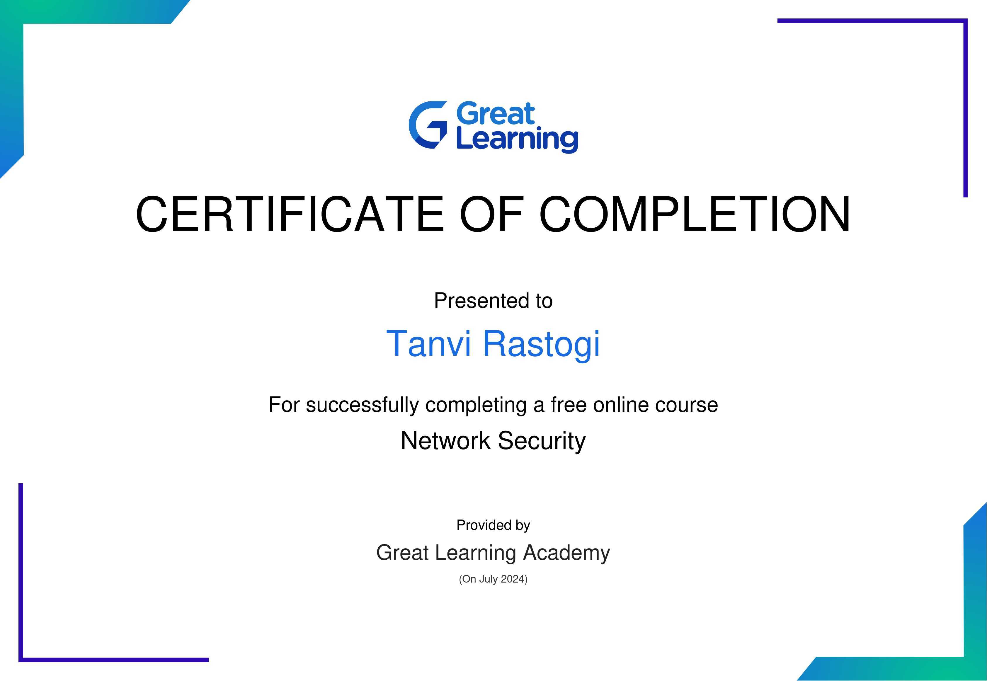 The certificate above verifies that Tanvi Rastogi has successfully completed the course Network Security