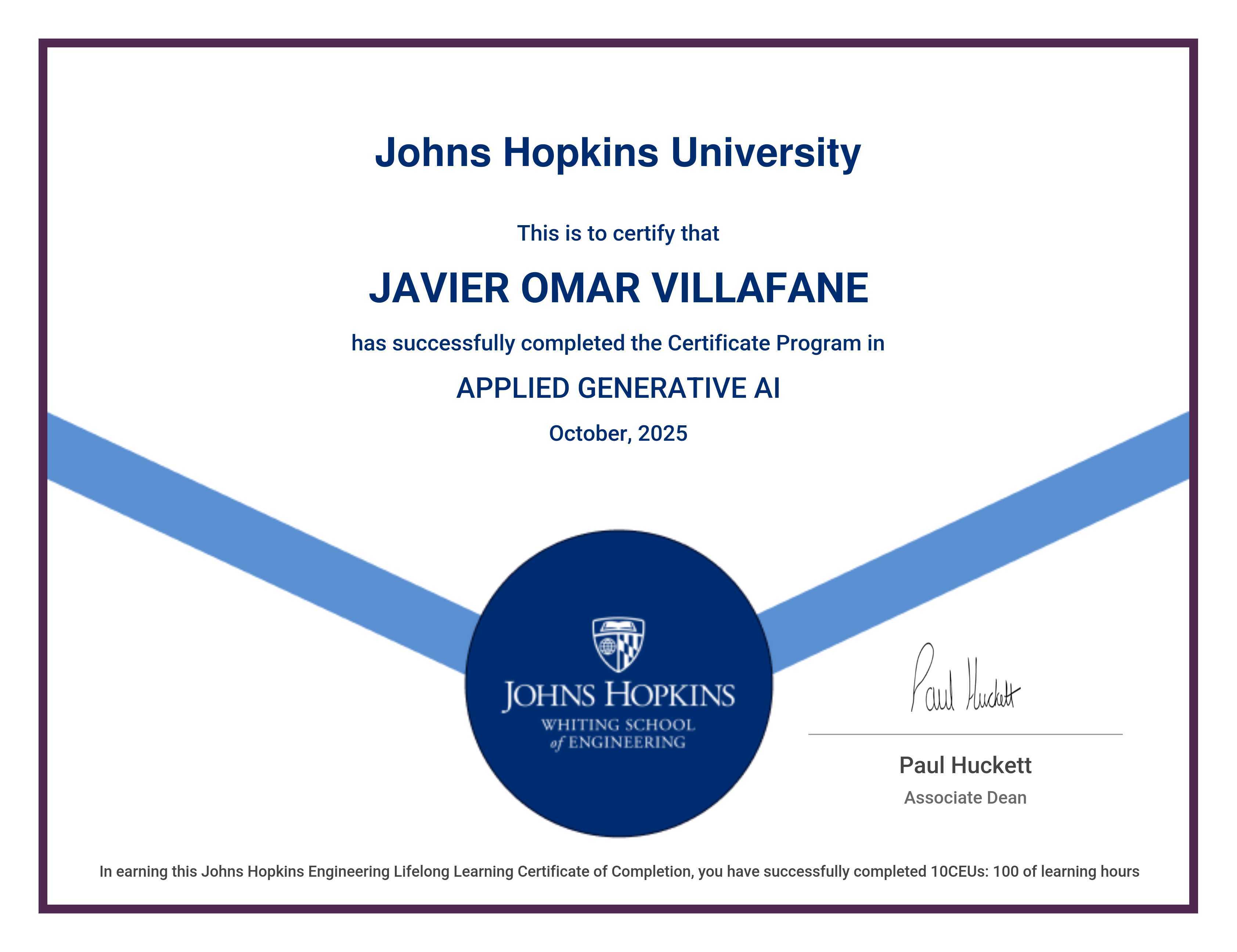 The certificate below verifies that JAVIER OMAR VILLAFANE has completed the APPLIED GENERATIVE AI